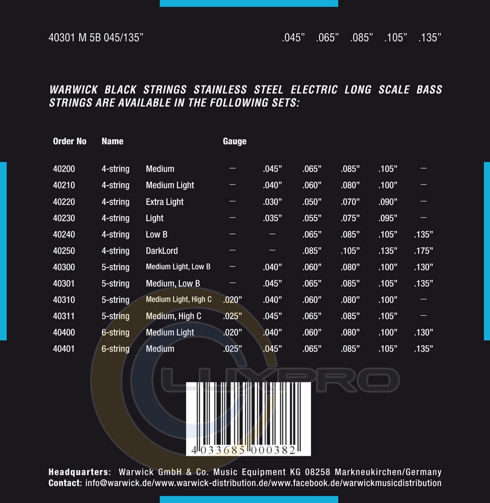 Струни для бас-гітари 40301 Black Label Medium 5-String (45-135) серії Black Label виготовлені з високоякісної нержавіючої сталі і виділяються приголомшливо яскравим звучанням, ідеально доповнює агресивний характер фірмового тембру Warwick. Ці струни мають ретельно підібраний баланс, ідеально будують і відрізняються абсолютно приголомшливою динамікою. Саме тому струни Black Label за замовчуванням встановлені на всі німецькі бас-гітари Warwick серії Teambuilt. Виготовлені в США.