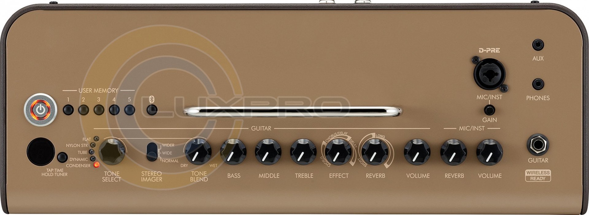 - управління: AMP, Gain, Master, Bass, Middle, Treble, Effect, Echo / REV, Guitar Output, Audio Output, User Memory Switch x 5, TAP / Tuner Switch;