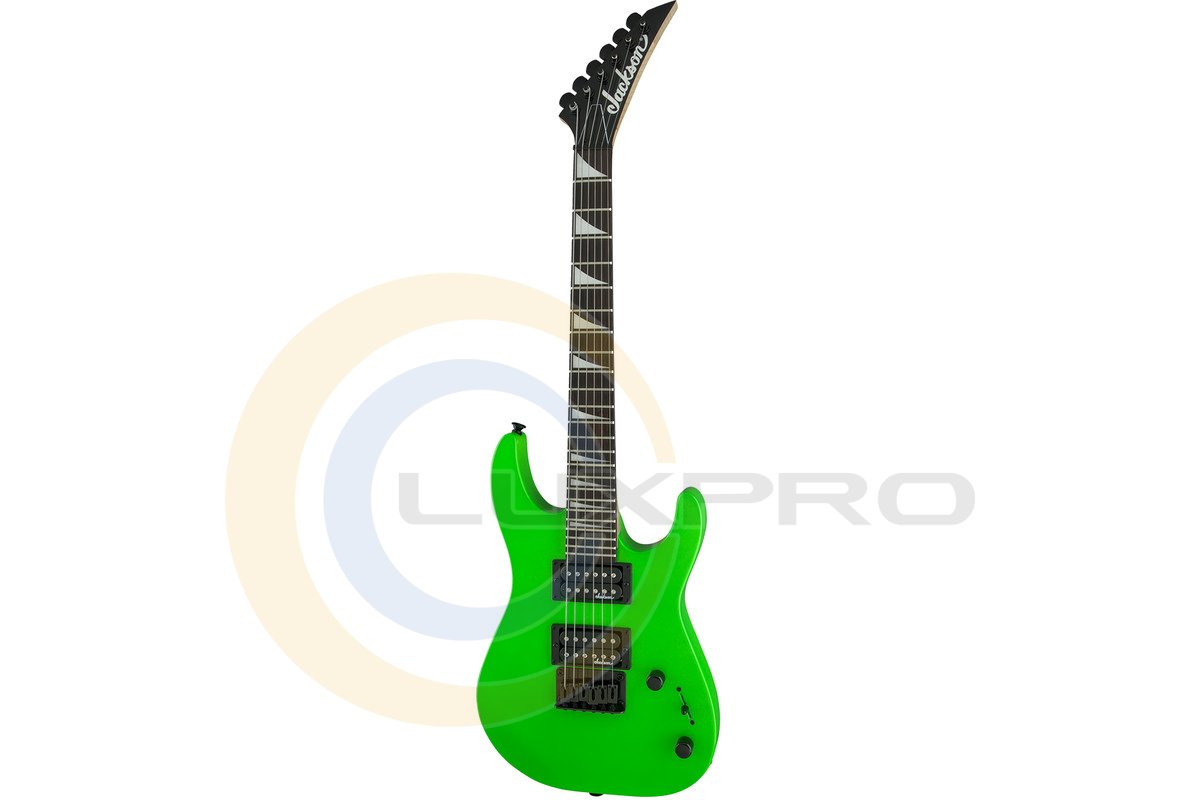 JS1X DINKY MINION AH NEON GREEN має деку з тополі, швидкісний болчений кленовий гриф з графітовими стрижнями для посилення, мензуру в 22.5 "і 12-дюймову накладку з амаранту з 24 ладами Jumbo і інструкцією у вигляді акулячих плавників. Загострена, відхилена назад голова грифа 6 -По-ряд Jackson сприяє рівномірному розподілу натягу, а скульптурна п'ята полегшує гру на верхніх ладах.