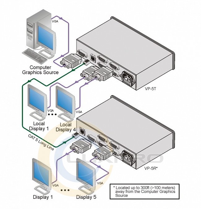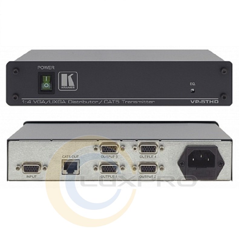 Після буферизації і розв'язки, розподіляє сигнал з єдиного входу на 4 ідентичних виходу VGA з 15-контактними роз'ємами, а також вихід для передачі сигналу по кабелю на кручений парі. Рекомендовані приймачі: PT-120, TP-105, TP-120, VP-5R, TP-202, TP-220HD.