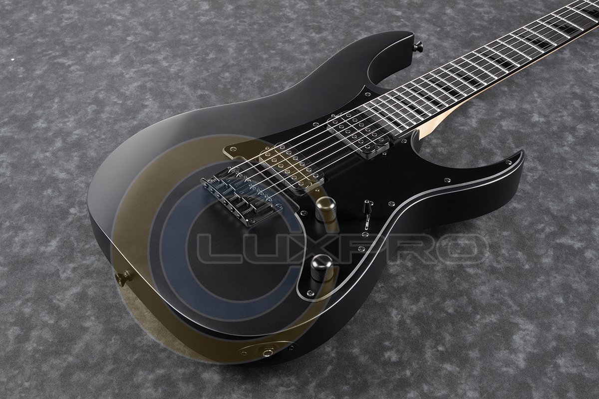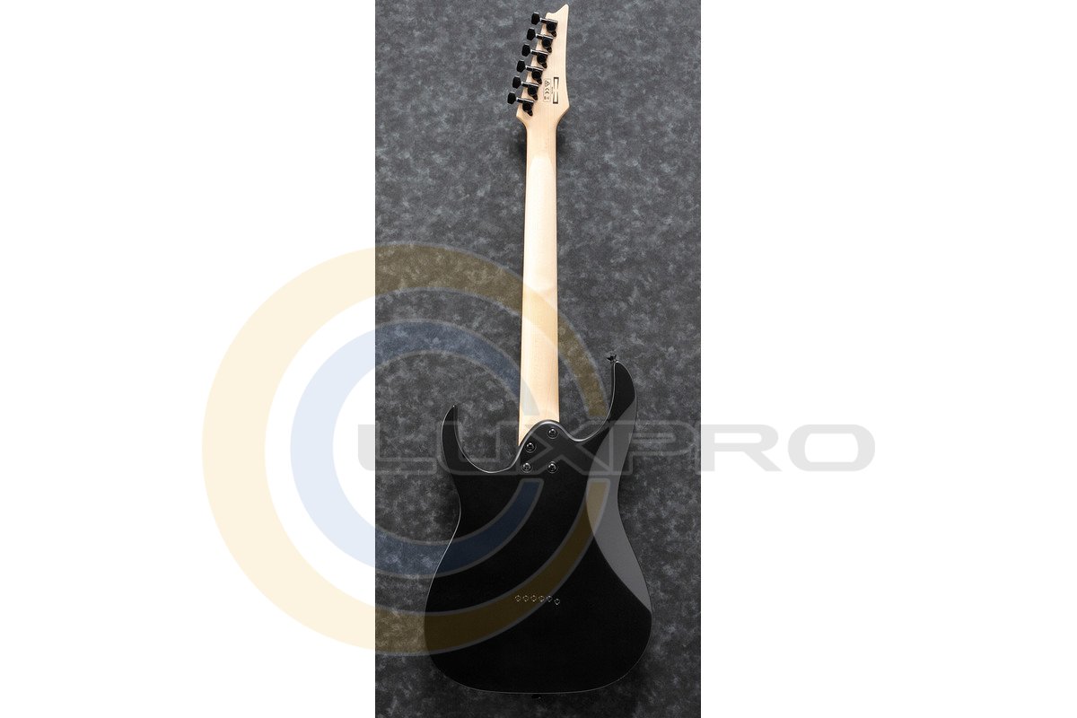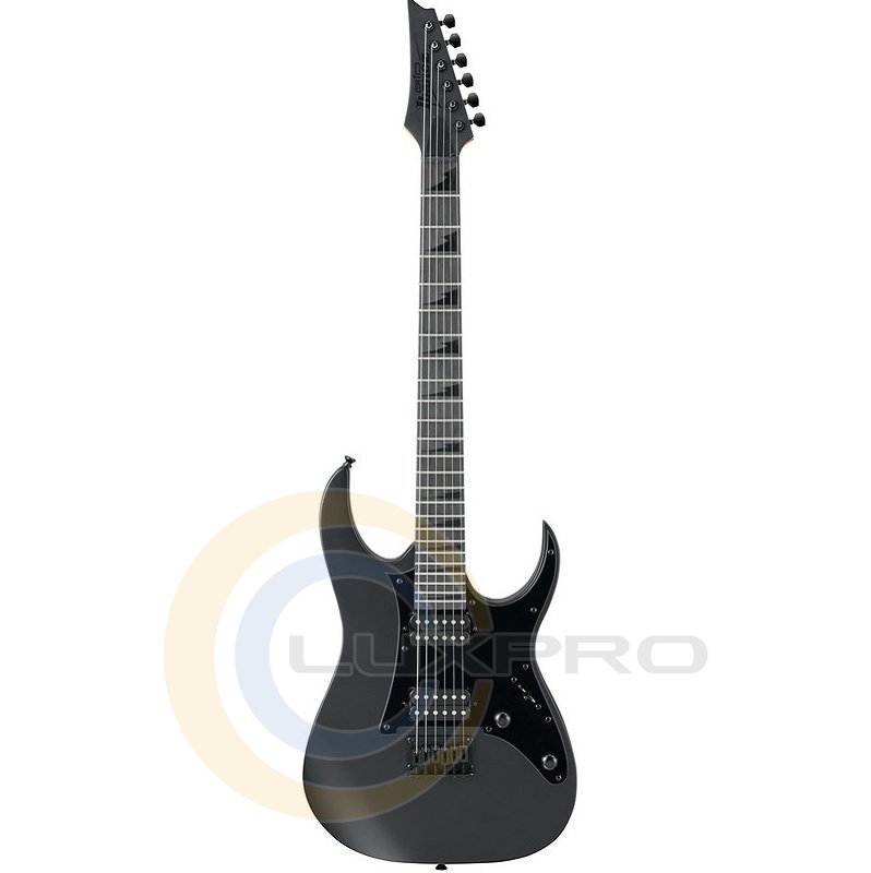 GRGR131EX BKF - електрогітара, витончена дека GRGR131EX-BKF зроблена з деревини тополі. Гриф гітари профілю GRGR - кленовий. Накладка на гриф - Purple heart (фіолетове дерево). На грифі 24 лади розміру Jumbo з інкрустацією у вигляді перевернутих чорних акулячих зубів. Звукознімачі - два пасивних хамбакера Infinity R з керамічними магнітами - видають теплий звук з прекрасно збалансованої артикуляцією, що підходить для широкого спектра музичних стилів. Перемикач - 5-позиційний. Звук налаштовується одним регулятором гучності і одним регулятором тону. Бридж - фіксований Ibanez F106. Модель представлена в елегантному чорному кольорі, з чорною головою грифа, чорної фурнітурою.