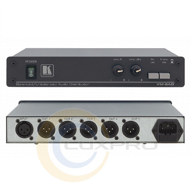 Kramer VM-5AD - настільний пристрій, яке випускається в надійному і міцному корпусі. За допомогою адаптера RK-MEDN воно може бути встановлено в стандартну 19 "стійку (займана висота - 1 U). Оптимальний рівень сигналу вибирається роздільними регуляторами лівого і правого каналів. Широкий динамічний діапазон дає можливість підсилити сигнал з мікрофонного входу до лінійного рівня за допомогою регуляторів. Активні схеми і відсутність трансформаторів дозволяють працювати в смузі пропускання 100 кГц без спотворень.