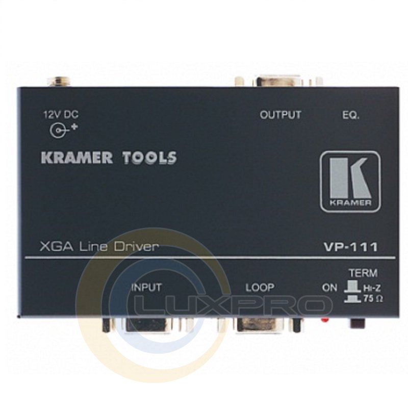 Регулятор під шліц на задній панелі дозволяє підлаштувати АЧХ кабелю, перемикач на передній панелі дозволяє включити / вимкнути термінатор для вхідного сигналу, перемикач на нижній частині пристрою встановлює ID bit. Смуга пропускання відео, що перевищує 480 МГц, забезпечує прозорість VP-111 для сигналів найвищого дозволу QXGA. Пристрій ідеально підходить для роботи з віддаленими моніторами, в презентаційних системах, що вимагають установки локального монітора, для систем з великим екраном (нарпімер, проекторів), розташованим на великих і далеких відстанях.