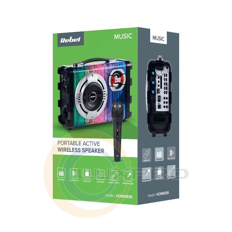Портативна акустична система KOM0836 має адаптованість до транспортування, універсальність підключення - ви можете з'єднати пристрій з мобільними гаджетами, ноутбуком або іншими пристроями. Висока якість звуку і привабливий дизайн.