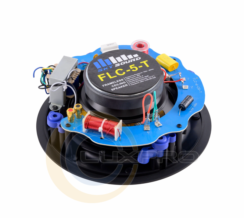 FLC-5TW оснащені 5-дюймовим низькочастотним динаміком і 0,75-дюймовою титановою пищалкой. Дифузор басовік виконаний з полімеру з хорошими антирезонансним характеристиками. Так як поліпропілен не боїться підвищеної вологості, а захисна сітка АС виконана з алюмінію, то таке поєднання значно розширює сферу даного динаміка в зволожених приміщеннях, ванних кімнатах або приміщеннях басейнів.Компактний безкаркасний корпус стельових динаміків FLC-5TW виготовлений з якісного полімеру ABS, додатково посиленого спеціальним наповнювачем для підвищення жорсткості і поліпшення антивібраційних властивостей. Захисна сітка колонки має магнітну фіксацію, що надає їй більш акуратний зовнішній вигляд і спрощує обслуговування. Стельові динаміки випускаються у виконанні чорного кольору і підходять для установки практично в будь-яких інтер'єрах.Характеристики: