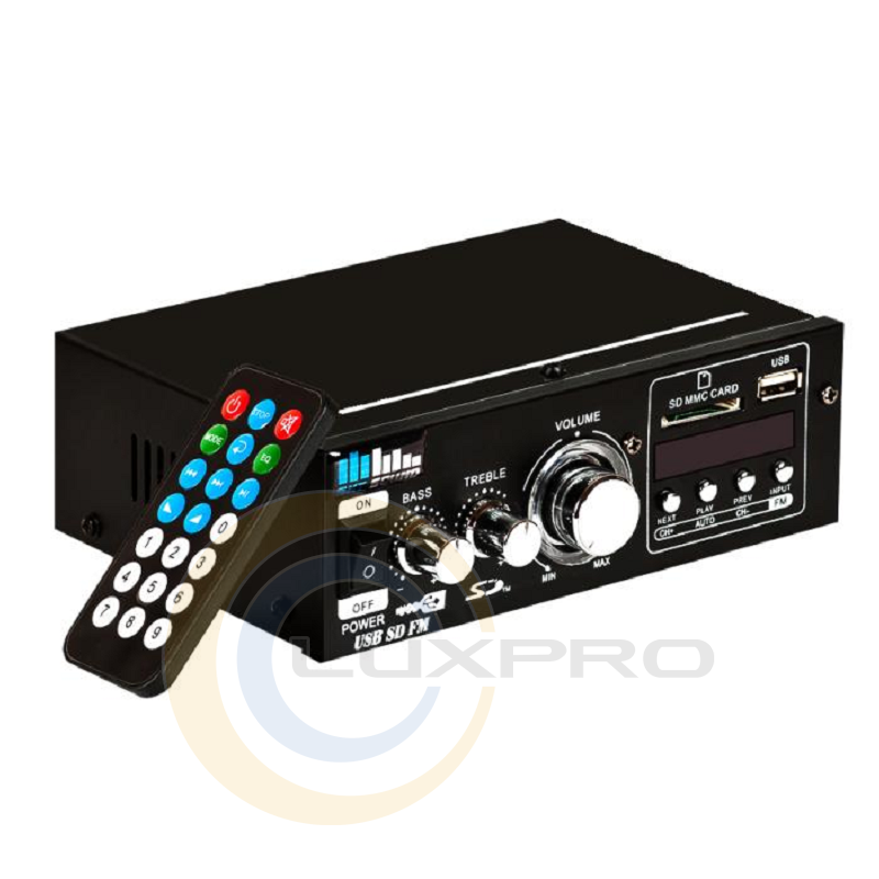 Підсилювач SD-088 (2*30W) Bluetooth. Потужність підсилювача 2 * 30Вт. Вбудований модуль програвача USB / MP3 і FM тюнера, Bluetooth. Двосмуговий еквалайзер для регулювання тембру для низьких і високих частот. Дистанційний пульт управління.