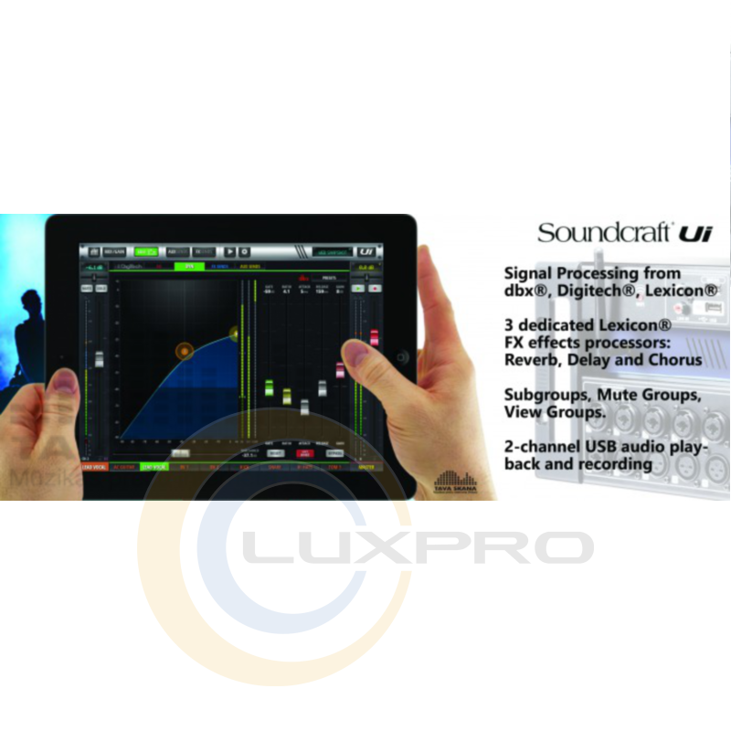 Soundcraft представляє нову лінійку мікшерів Ui Series. Всі пристрої серії характеризуються крос-платформної сумісністю з усіма найбільш популярними ОС: iOS, Android, Windows, Mac OS і Linux, а також можливістю одночасної роботи з великою кількістю керуючих девайсів (до 10).Мікшерні пульти Ui серії мають крос-платформену сумісність з прошивкою, Android, Windows, Mac OS, Linux і пристроїв, і може використовувати до 10 пристроїв управління одночасно. Крім того, в Ui12 і Ui16 кожна функція вбудованої обробки сигналу від HARMAN DBX, DigiTech і Lexicon, в тому числі DBX AFS2, DigiTech Amp моделювання, і багато іншого. Обидві моделі оснащені повністю відкликається і дистанційним керуванням мікрофонного посилення і фантомним живленням, поряд з 4-смуговим параметричним еквалайзером, фільтром високих частот, компресор, де-Esser-гейт і на вхідних каналів.Обидва мікшера пропонують 31-смуговий графічний еквалайзер, гейт і компресор на всіх виходах, а також в режимі реального часу частотного аналізатора (RTA) на входах і виходах. Вбудований в три спеціалізовані Лексикон FX: Reverb, Delay і хор. Крім того, елементи управління мікшера включає підгрупи групи приглушення. Обидва мікшера пропонують незалежні мережеві інтерфейси на борту для одночасного управління по Wi-Fi і Ethernet, а також напів-готовності міцний корпус для живих виступів.Характеристики: