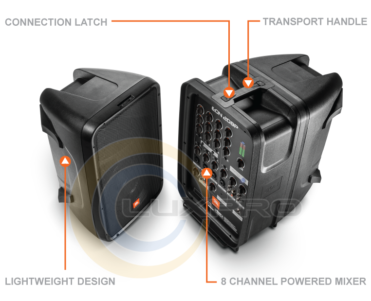 Отримайте легендарне якість звуку за допомогою портативного акустична системи EON208P «все в одному» з 8-канальний мікшер, аудіо Bluetooth і мікрофон AKG. Завдяки зручному дизайну в валізці, EON208P дозволяє легко отримати відмінний звук для виступів, зустрічей і заходів. 8-канальний знімний мікшер забезпечує професійні з'єднання для мікрофонів, інструментів і джерел лінійного рівня, в той час як 8-канальні двоканальні стереодинаміки забезпечують кращу в своєму класі освітлення аудиторії. З'єднання Bluetooth також дозволяє вам передавати звук зі своїм мобільним пристроєм. ПРИ 300 потужності Вт у вас буде більш ніж достатньо звуку. Крім того, компактний і легкий форм-фактор означає, що ви можете носити всю систему однією рукою.Характеристики: