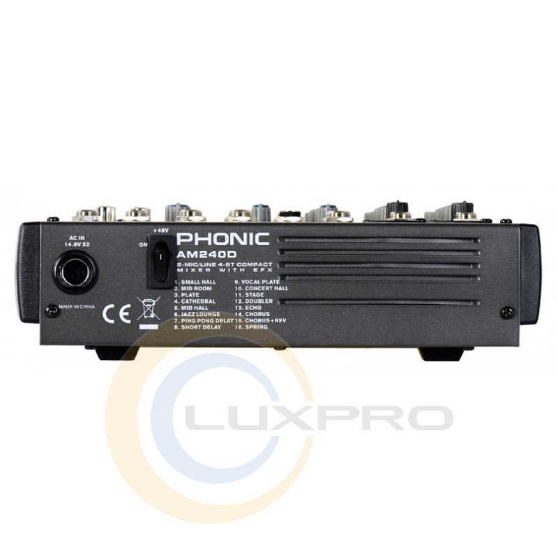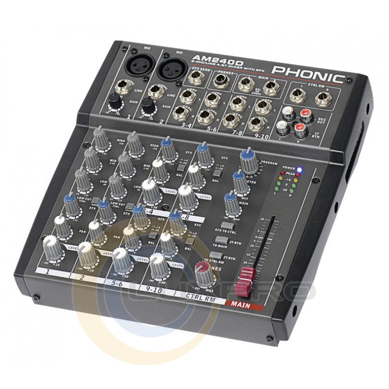 AM240D - мікшерний пульт серії AM компактний і універсальний, мають від 5 до 24 монофонических мікрофонних / лінійних і стереовходів. Сверхмалошумящие попередні підсилювачі забезпечують високу якість звуку при використанні в проектних студіях або для посилення звуку. Низькочастотні фільтри на моноканалах усувають небажані звуки, такі як гуркіт, P-pops шуми, шум вітру і низькочастотні резонанси в студії. Багатосмуговий еквалайзер на моноканалах дає вам повний контроль над вашим міксом. Серія AM також полегшує моніторинг міксу завдяки двом Багатосегментний світлодіодним індикаторам рівня і потужним виходів для навушників.
