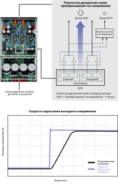 Ми вибрали цю модель після ретельного аналізу всіх її достоїнств - не тільки за високоточну обробку 32-бітного аудіосигналу, а й за можливості обробляти великі обсяги аудіо, потужності звуку в нижньому регістрі та виключної чіткості в верхньому. Завдяки вбудованому тактового генератора ЦАП має функцію Jitter Eliminator, яка дозволяє виконувати Ц / А-перетворення з вкрай низьким рівнем джиттера. Вбудований в процесор 8-канальний ЦАП включає по два 4-канальних операційних підсилювача зліва і справа. Він забезпечує виключно високу якість вихідного сигналу з відмінним ставленням сигнал / шум, оскільки використовує схему аналогового перетворення симетричною кофигурации.