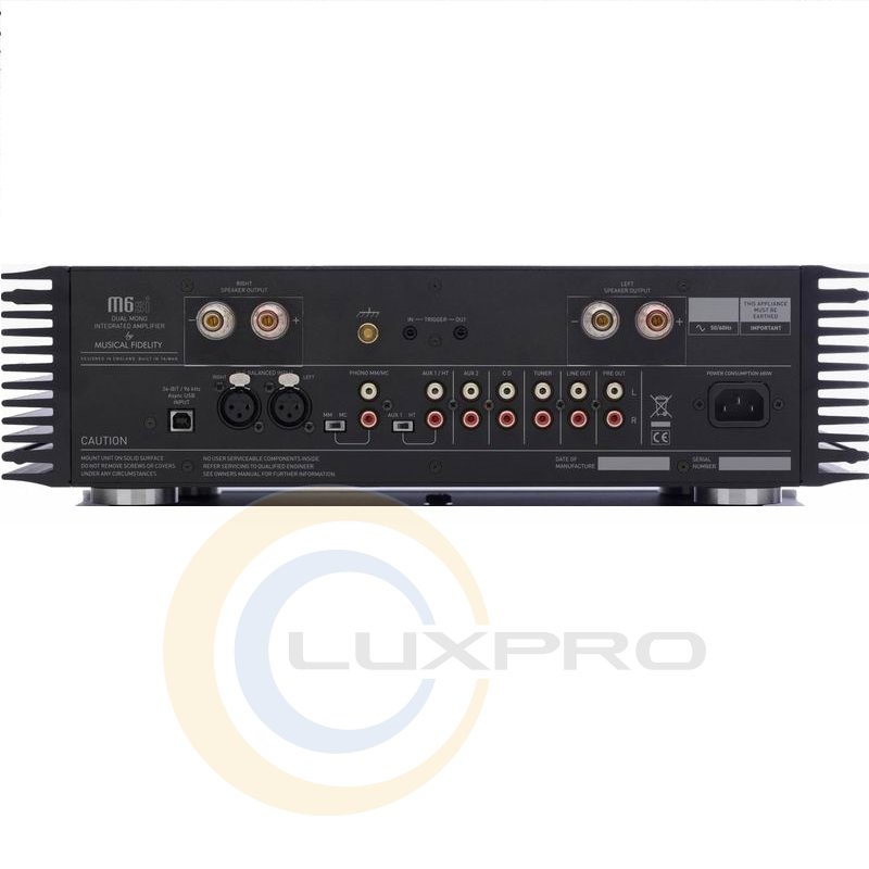 MUSICAL FIDELITY M6si побудований за трехблочной схемою, що складається з двох ідентичних підсилювачів потужності і моноблочного попереднього підсилювача. Живлення підсилювачів потужності і блоку попередніх підсилювачів здійснюється від роздільних джерел з потужними фільтруючими конденсаторами. Незважаючи на моноблочне виконання попереднього підсилювача, інженери взяли спеціальні заходи для забезпечення максимальної ідентичності характеристик лівого і правого каналів.У M6Si широко використовується технологія поверхневого монтажу елементів на базі фірмових прецизійних комплектуючих SMD Musical Fidelity. Це дозволило істотно скоротити електричний шлях аудіосигналу, а також знизити вплив паразитних ємностей і індуктивностей друкованих провідників на якість звуку. Тепер навіть найскладніші і динамічні твори будуть відтворюватися з максимальною точністю і реалізмом.M6Si - це по-справжньому сучасний і універсальний апарат з високою потужністю і приголомшливим якістю звучання. Розширене комутаційне обладнання дає можливість підключити до M6Si всі сучасні джерела аудіосигналу. У M6Si передбачений порт для підключення вінілового програвача. Вбудований високоякісний фонокоректор сумісний з MM і MC картриджами. Для відтворення цифрової потокової музики в M6Si передбачений порт USB.Апарат має низький коефіцієнт нелінійних спотворень (0,007% в діапазоні від 20 Гц до 20 кГц), високою вихідною потужністю (220 Вт при 8 Ом) і підвищеним коефіцієнтом демпфірування. Малий рівень перехресних перешкод дозволяє порівнювати M6Si з аудіофільских моноблоковими підсилювачами. Вбудований в M6Si високоякісний цифроаналоговий перетворювач підтримує відтворення цифрового потоку даних з розрядністю 24 біт і частотою квантування 96 кГц.Характеристики: