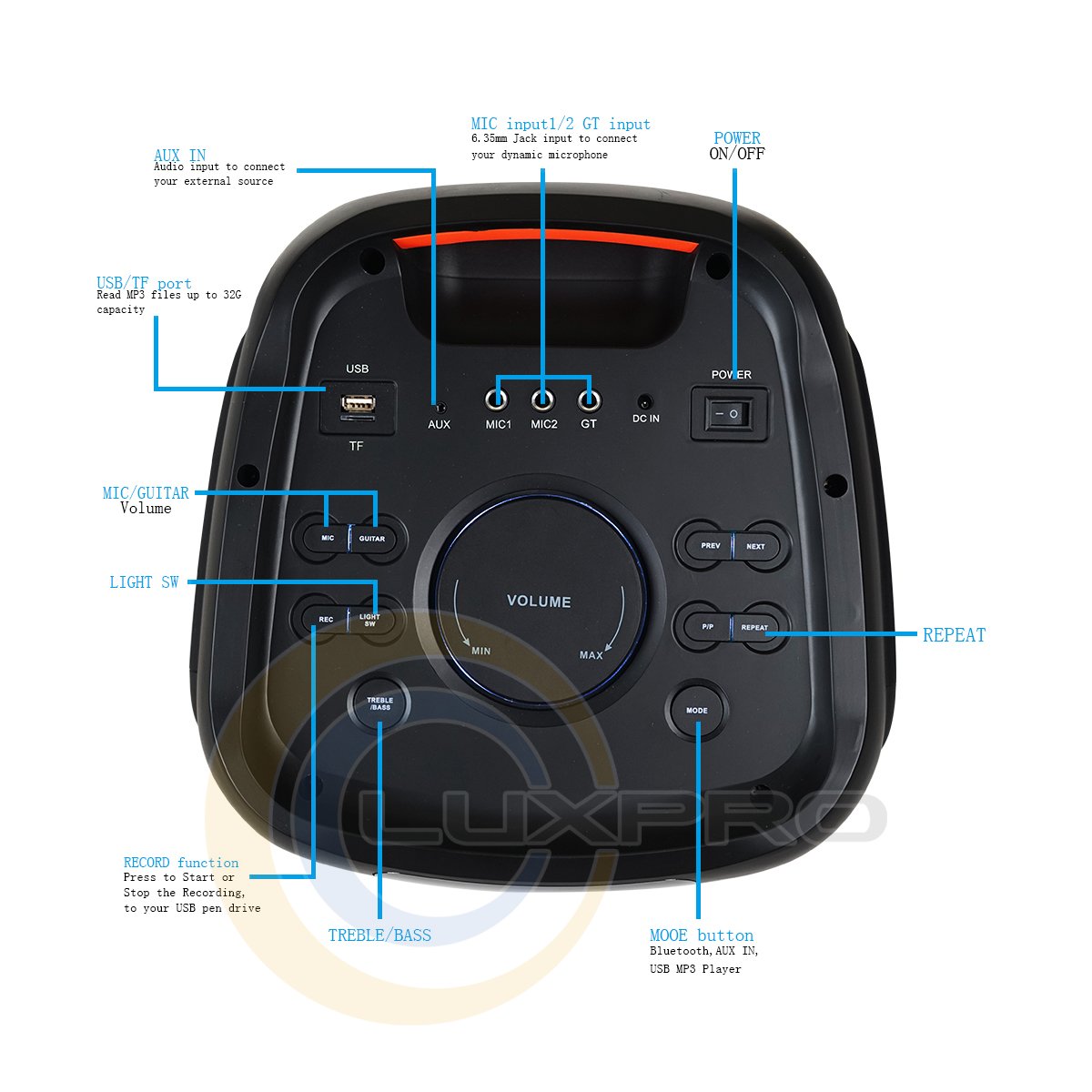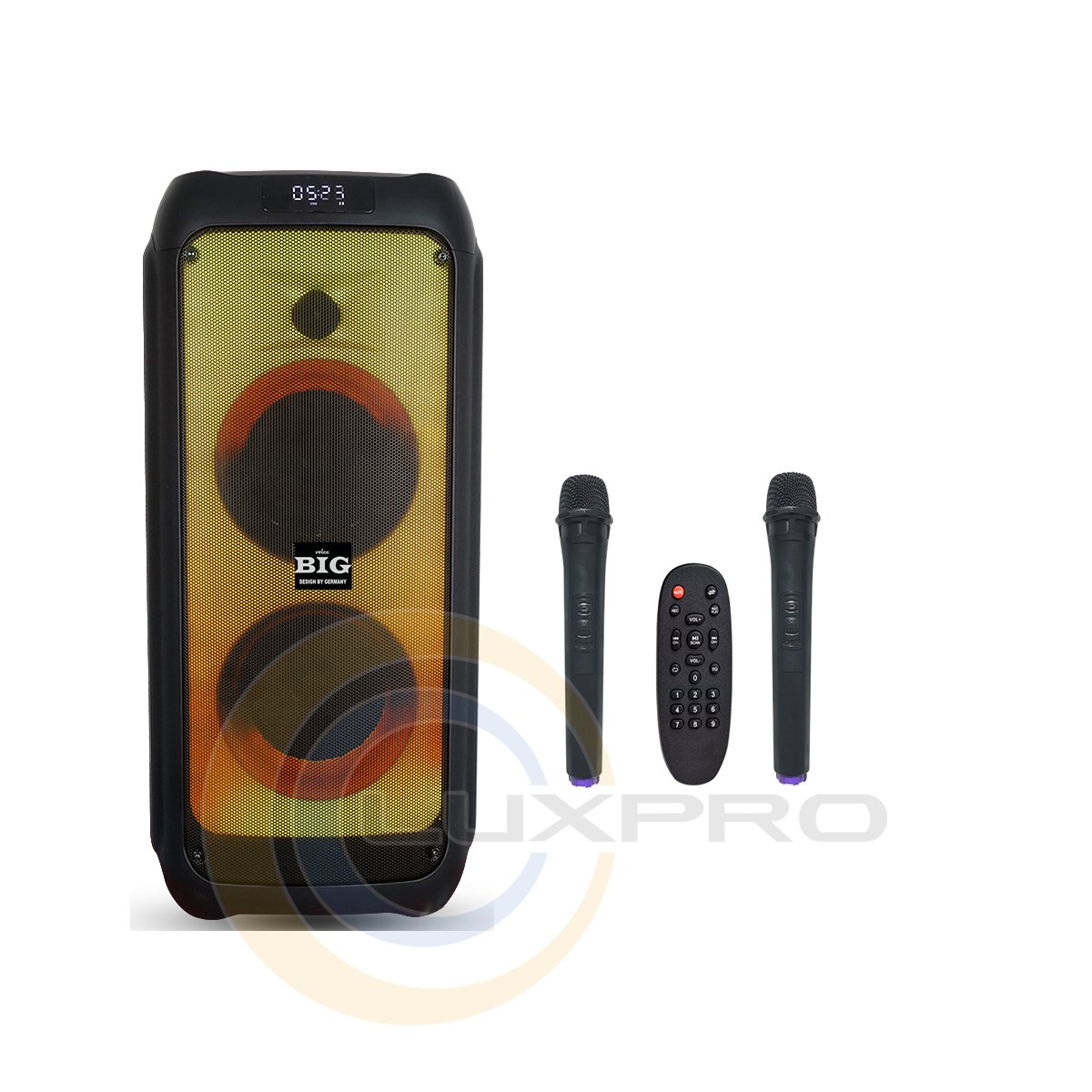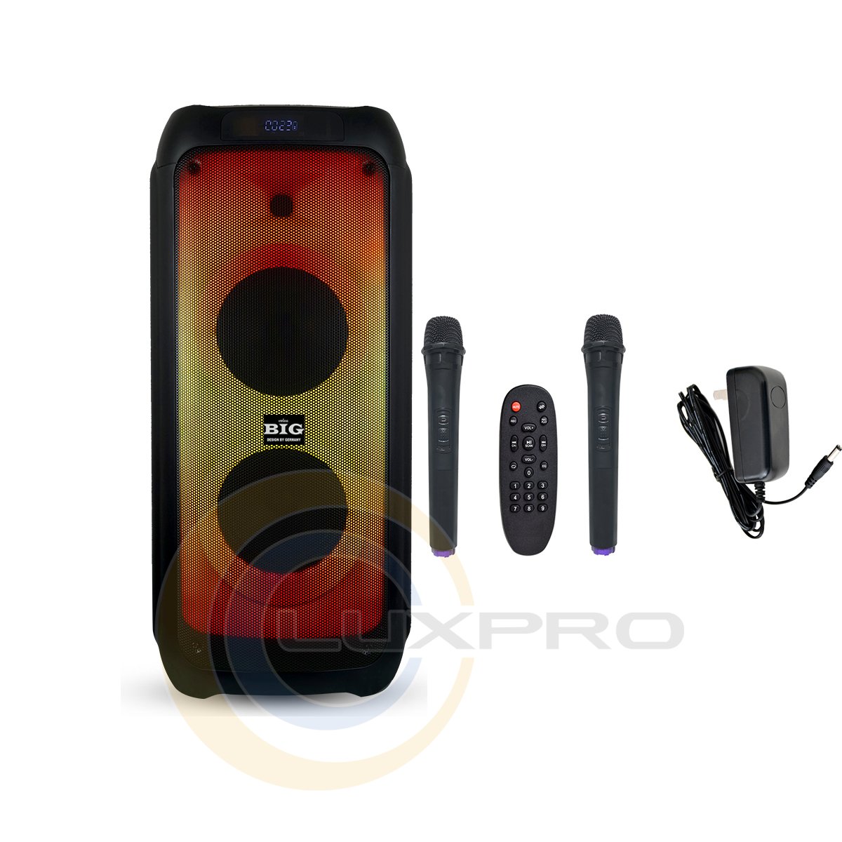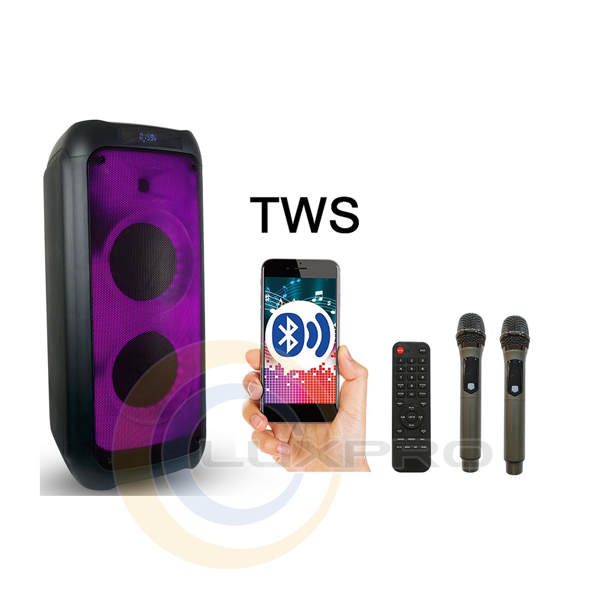 | Інтерфейси: | Bluetooth, FM тюнер, microUSB, USB, Два радіомікрофона, Мікрофон, Пульт ДУ |