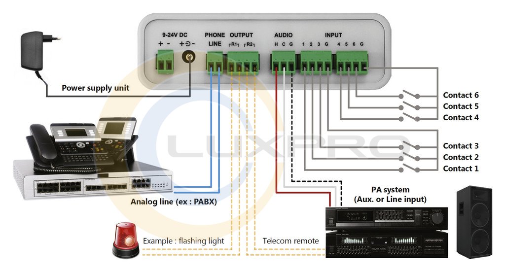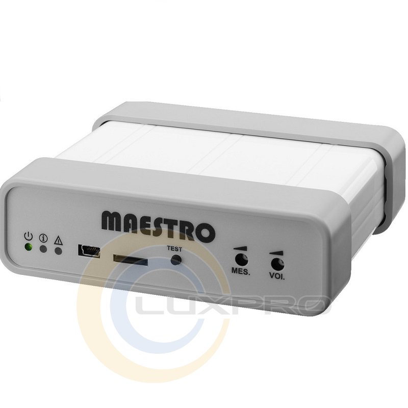 Адаптер MAESTRO-1 має можливість оголошення для кожного телефону, підключеного до телефонної системи. Автоматичний прийом дзвінків. Автоматичне відключення. Дзвінок може бути активований в міру необхідності. Вбудована карта micro SD (4 ГБ) для зберігання оголошень (аудіофайли у форматі MP3 або WAV). Аналогове телефонне з'єднання (2-дротове з'єднання). Підключення через вставні гвинтові клеми. Порт міні-USB для настройки MAESTRO-1 через ПК або ноутбук. Харчування здійснюється від прикладеного підключається блоку живлення. Поставляється з USB-кабелем.