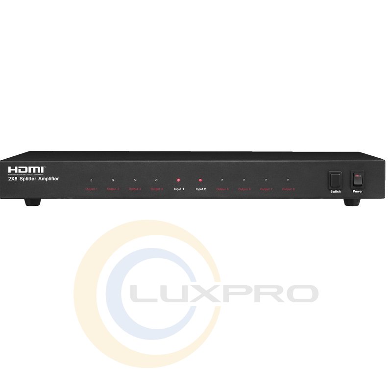 Джерело вхідного сигналу можна вибрати за допомогою перемикача. Сумісність з HDMI ™ Deep Color. Відповідає стандарту HDCP. Входи: 2 x 19-контактний роз'єм HDMI ™ Type-A. Виходи: 8 x 19-контактних роз'ємів HDMI ™ Type-A. Харчування здійснюється від закритого блоку живлення. Розміри: 440 x 55 x 210 мм. Вага: 2,4 кг.