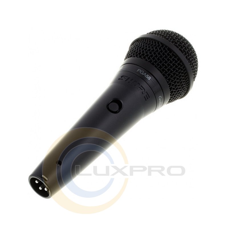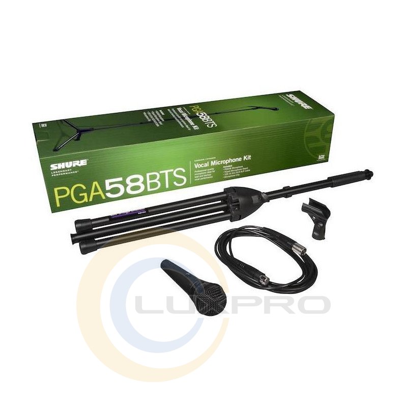 PGA58BTS - мікрофон укладений в компактний корпус чорного кольору з зручно розташованої кнопкою включення / вимикання, капсуль захищений надійною гратами, також чорного кольору. Комутація здійснюється за допомогою кабелю XLR-XLR 6,3 мм (в комплекті). Також в комплекті з мікрофоном йде адаптер для кріплення на стійку, чохол на блискавці для перенесення і зберігання і пряма телескопічна стійка.