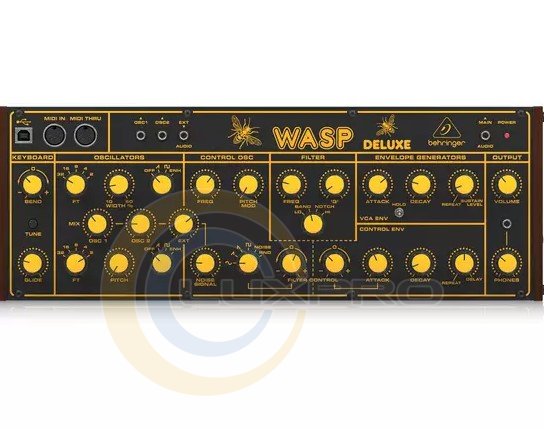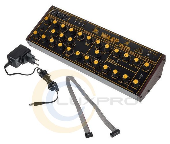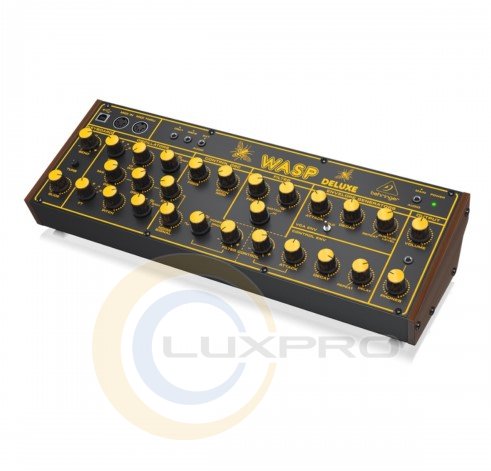 Behringer WASP Deluxe - гібридний монофонический синтезатор, копія класичної моделі EDP Wasp. Оригінальний інструмент відомий завдяки своєму різкого і гострого звучання. EDP Wasp був заснований на здвоєному цифровому осцилляторе зі здвоєними огинають і оснащувався аналоговим мультірежімним фільтром і секцією модуляції. Копія в точності повторює всі схеми оригінального інструменту. Модель оснащується точними копіями оригінальних транзисторів і JFET.