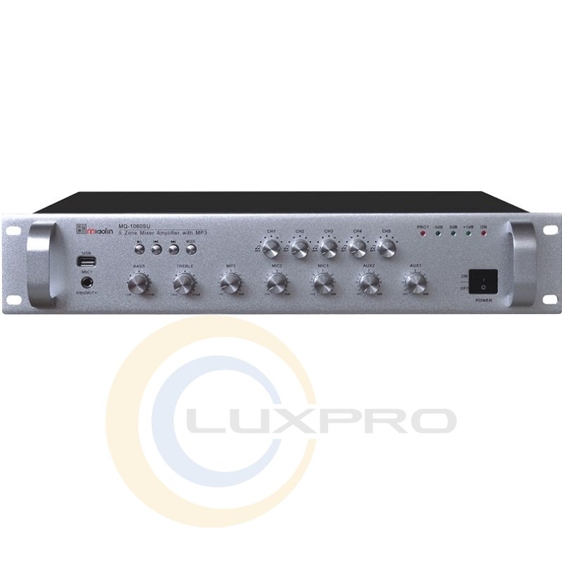 Y-1500SU це трансляційний підсилювач з наявністю п'яти зон і можливістю окремого регулювання гучності кожної зони. Потужність підсилювача складає 500 Вт, а вихідна харчування 70/100 Вольт. Надійний металевий корпус зі стильною, алюмінієвою передньою панеллю сріблястого кольору, відмінно підійде під будь-який інтер'єр і буде прикрашати Ваше приміщення.Крім усього в даній моделі є кілька варіантів розташування в робочому просторі. Можливий варіант горизонтального розташування на полицю, стіл і т.д. або ж за допомогою спеціальних кріплень встановити підсилювач в рекову стійку. Y-1500SU призначений для експлуатації у великих приміщеннях, а саме: великих магазинах одягу, супермаркетах, офісах будівлях, ресторанах і подібних місцях, де здійснюється фонове озвучення місцевості. Підсилювач обладнаний USB входом, завдяки якому у Вас є можливість підключати всілякі USB накопичувачі або плеєра.Еквалайзер і ручки установки гучності для кожної зони на передній частині підсилювача, відповідають за коригування параметрів вихідного звуку. Модель підсилювача Younasi Y-1500SU обладнана двома входами під мікрофони, двома входами AUX і одним лінійним виходом.Характеристики: