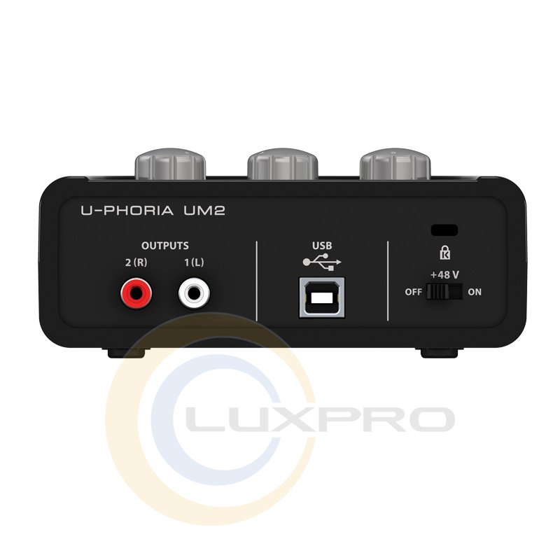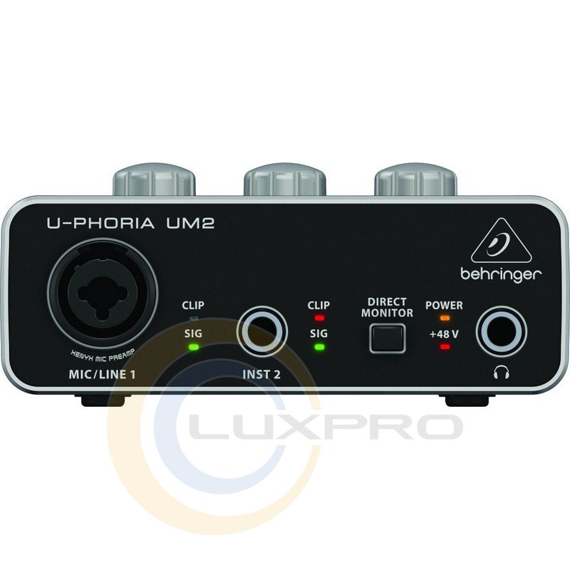 Вихід на навушники оснащений регулятором гучності та можливістю вибору прямого монітора. Індикатори відображають статус, сигнал та перевантаження. USB-інтерфейс BEHRINGER UM2 призначається для роботи з комп'ютерами з інстальованою ОС Windows або Mac OS X. Він сумісний із популярними сучасними програмними пакетами редакції звуку – Ableton Live, Steinberg Cubase, Avid Pro Tools.