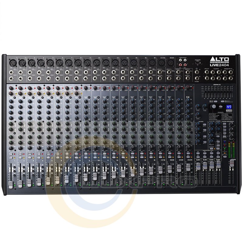 Alto Professional Live 2404 це професійний 24-канальний мікшерний пульт, функціонал якого дозволить вам створити чудовий мікс. Гнучка маршрутизація і безліч вбудованих DSP ефектів, роблять цю модель прекрасним вибором для проведення різних заходів: конференцій, презентацій, камерних виступів і т.д. Мікшер оснащений вісімнадцятьма балансними XLR входами з відключається фантомним харчуванням, 3-смуговим еквалайзером з параметричною серединою, чотирма AUX шинами для підключення зовнішніх ефектів або моніторингу і 9-смуговим майстер-еквалайзером для основного або мониторного виходу. 60мм фейдери з функціями PFL / AFL і світлодіодні індикатори сигналу забезпечують точний контроль і інформативність.