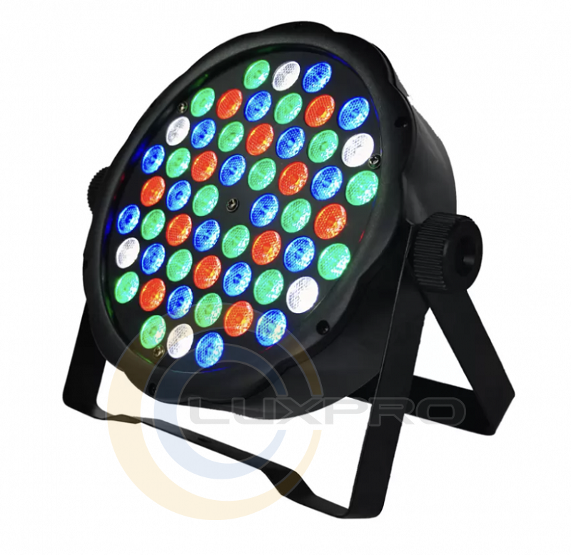 Прожектор LED PAR RGBW 54x1W оснащений подвійним П-подібним кронштейном з можливістю регулювання кута нахилу. Його можна використовувати як ніжку при установці на підлогу або для підвісу в будь-якій площині. Можливість керування будь-яким стандартним DMX-контролером. Управління займає 4/8 DMX каналів.