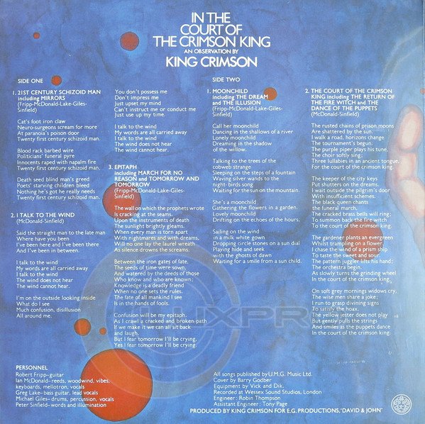 Цей диск вплинув на розвиток психоделічного року, прогресивного року і хеві-метал. Альбом записаний із винятковою музичністю, поетикою текстів. У той час як одні рок-групи (наприклад, Pink Floyd) були схильні до творення довгих композицій, а інші намагалися вмістити у рок-пісню свободу джазової форми (Френк Заппа), в In the Court of the Crimson King група використовувала химерну поезію блейковських кошмарів, видінь та передчуттів. Групу завжди відносили до так званого жанру «інтелігентного важкого металу» (цьому сприяла заява Роберта Фріппа, що при створенні групи у нього була саме така мета), і перший їх альбом створив цей жанр [джерело не вказано 1093 дня], а також просунув музичну думку вперед відразу по кількох напрямках.