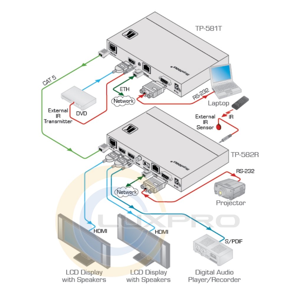 Передавач сигналів HDMI, двонаправленого RS-232, Ethernet і ІК-інтерфейсу по кручений паріTP-581T - передавач сигналів HDMI, Ethernet, двонаправленого інтерфейсу RS-232 і ІК інтерфейсу по кручений парі. Вхідний сигнал HDMI і сигнали інших перерахованих інтерфейсів перетворюються в формат для передачі по кручений парі. Приймач TP-582R виконує зворотне перетворення, видаючи сигнали на виходи Ethernet 100BaseT, RS-232, ІК-інтерфейсу і 2 виходи HDMI. Крім того, виділений з HDMI аудіосигнал видається на виходи S / PDIF і TOSLINK®.УВАГА! Дані прилади працюють тільки з кабелями екранованої кручений пари (FTP або STP), розібраними на екрановані роз'єми RJ-45. Використання неекранованих кабелів UTP не допускається.УВАГА! Кабелі екранованої кручений пари розправляються на обох кінцях кабелю за однією схемою (наприклад, EIA / TIA 568В) - т.зв. "Пряма" розводка. Неправильна обробка кабелю може призвести до незворотного пошкодження приладів.УВАГА! Підключення до активного обладнання Ethernet може привести до виходу з ладу всього обладнання. Для підключення використовуйте тільки сумісні прилади Kramer.Характеристики: