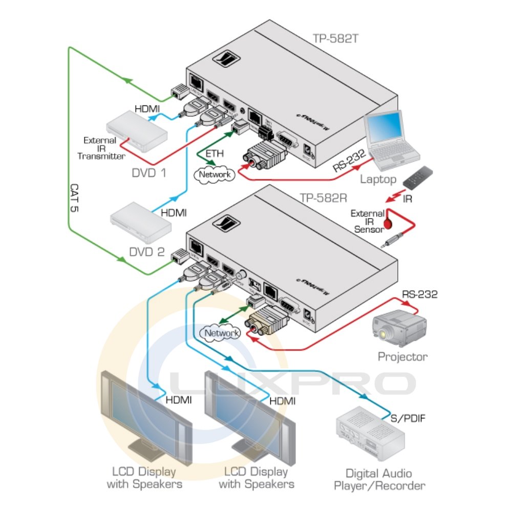 Приймач сигналів HDMI, двонаправленого RS-232, Ethernet і ІК-інтерфейсу по кручений паріTP-582R - приймач сигналів HDMI, Ethernet, двонаправленого інтерфейсу RS-232 і ІК інтерфейсу по кручений парі. Передавач TP-582T перетворює вхідний сигнал HDMI і сигнали інших перерахованих інтерфейсів в формат для передачі по кручений парі. Приймач TP-582R виконує зворотне перетворення, видаючи сигнали на виходи Ethernet 100BaseT, RS-232, ІК-інтерфейсу і 2 виходи HDMI. Крім того, виділений з HDMI аудіосигнал видається на виходи S / PDIF і TOSLINK.УВАГА! Дані прилади працюють тільки з кабелями екранованої кручений пари (FTP або STP), розібраними на екрановані роз'єми RJ-45. Використання неекранованих кабелів UTP не допускається.УВАГА! Кабелі екранованої кручений пари розправляються на обох кінцях кабелю за однією схемою (наприклад, EIA / TIA 568В) - т.зв. "Пряма" розводка. Неправильна обробка кабелю може призвести до незворотного пошкодження приладів.УВАГА! Підключення до активного обладнання Ethernet може привести до виходу з ладу всього обладнання. Для підключення використовуйте тільки сумісні прилади Kramer.Характеристики: