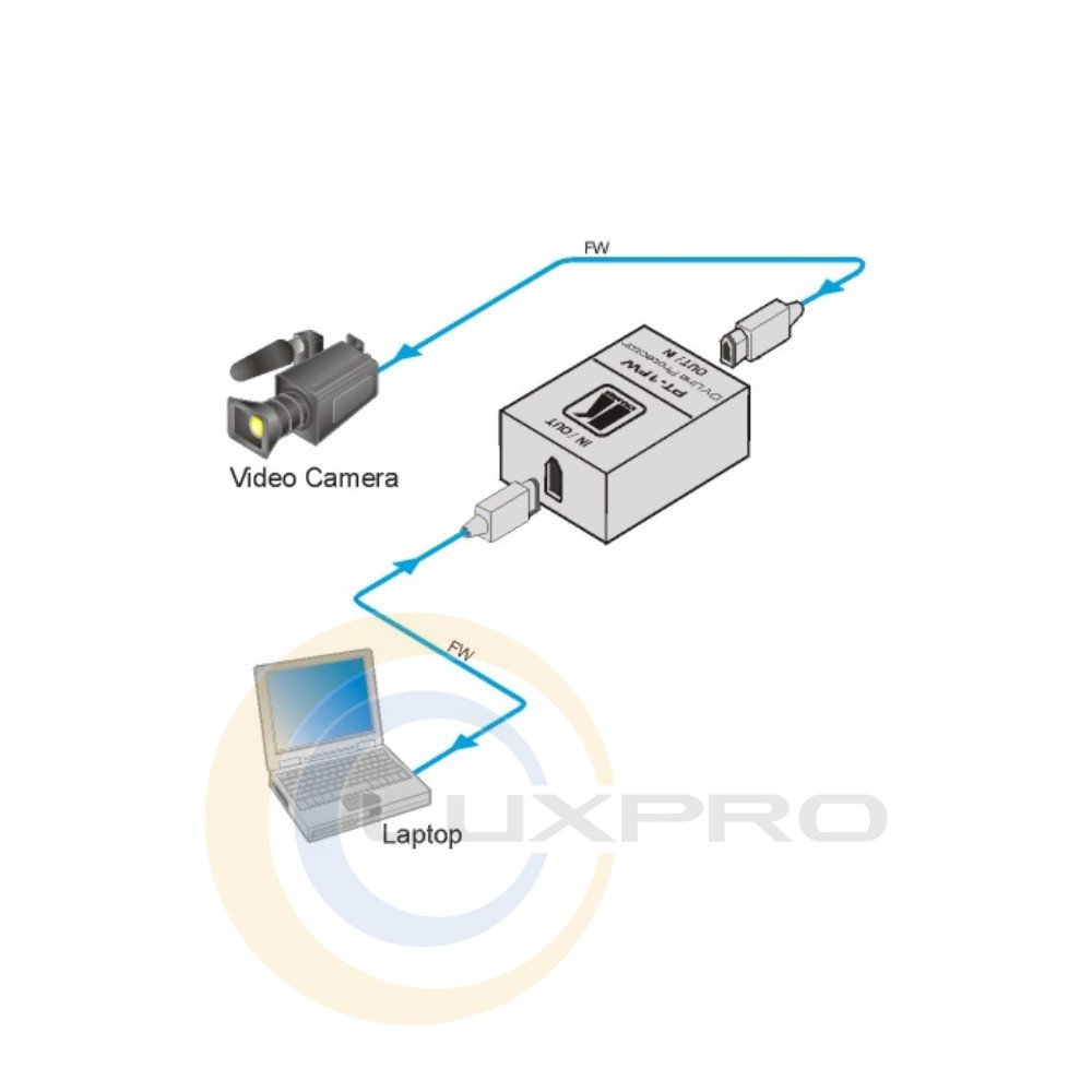 Пристрій захисту підключень для лінії Firewire.PT-1FW - пристрій захисту підключень для лінії Firewire. Найчастіше при підключенні «живого» джерела сигналу DV до приймача різниця потенціалів чи інші високовольтні розряди (викликані статичною електрикою, поганим заземленням та ін.) Можуть викликати пошкодження, що підключаються. Таке високе напруження іноді проявляється у вигляді іскор при торканні контактів, а іноді проявів не видно, але все одно воно може привести до поломки вимагає дорогого ремонту. PT-1FW включається між двома кабелями і пригнічує всі перехідні напруги до допустимого рівня. Це «рятувальник життів» студійного і іншого DV-обладнання. Використовуються 6-контактні роз'єми Firewire.Характеристики: