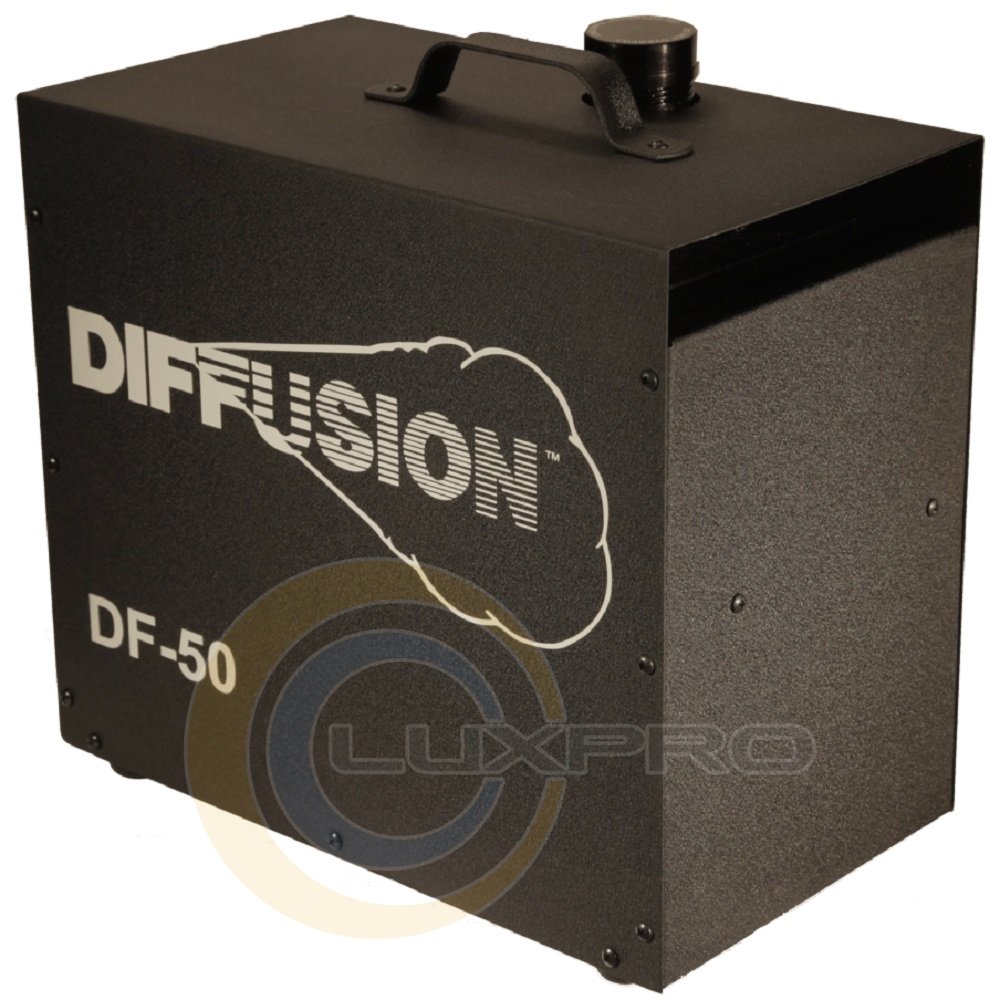 Diffusion Hazer (DF-50) є запатентованою машиною, що використовує систему потрійної фільтрації, яка розкладає дифузійну рідину (суміш харчової мінеральної олії) на однорідні краплі розміром 1 мікрон. CAL/OSHA дійшли висновку, що ці рівні зваженого повітря туману не перевищують OSHA або CAL/OSHA. REEL EFX DF50 DMX Fog Machine – генератор дифузійного диму. Час роботи дим-машини – понад 3 години у закритому просторі. Не потребує прогріву. Рідина хейзера не пахне і залишає ніякого осаду, якщо використовується правильно. Вміщує 2 літри рідини, робочий час 35 годинХарактеристики: