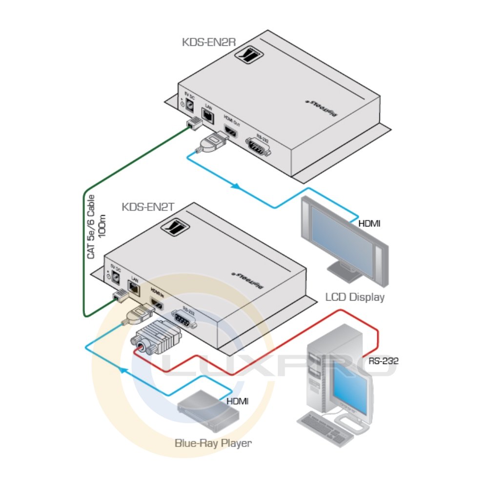 Пристрій для передачі сигналу HDMI і сигналу управління RS-232 по кручений паріKDS-EN2T - пристрій для передачі сигналу HDMI і сигналу управління RS-232 по кручений парі, що дозволяє передавати високоякісний відео та аудіо сигнал за стандартними лініях 1000BaseT категорії 5е, 6, 7. Пристрій використовує технологію компресії відео даних JPEG2000. При використанні в комплекті з приймачем KDS-EN2R підтримує передачу сигналів в форматах високої чіткості дозволом до 1080p зі вбудованим стерео звуком і сигналу управління. Відповідає вимогам HDCP. Сигнал управління вихідним пристроєм формується на стороні передавача KDS-EN2T. Підтримується одночасне використання до дев'яти передавальних модулів і до 81 приймають.Увага! При роздільній здатності 1080p кожен канал прийому-передачі вимагає швидкості передачі даних 55 Мбіт / сек.Характеристики: