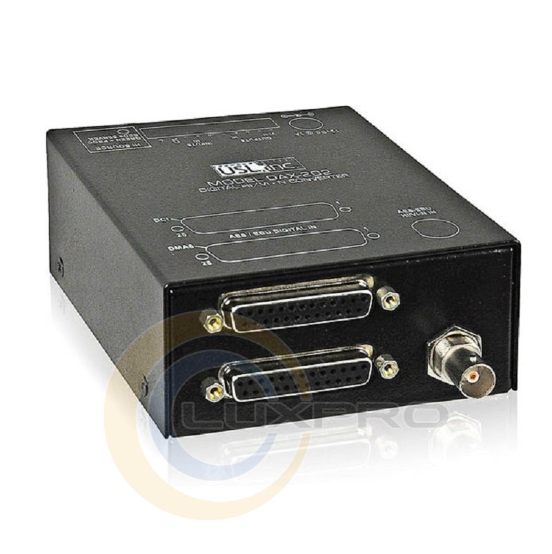Користувач може вибрати канали AES-EBU 7/8 або 15/16 або будь-який зовнішній вхід BNC. Використовуючи автоматизацію кінотеатру, користувач може вибрати HI канал від кінопроцесора або аудіо серверів. Два 25-контактні роз'єми D-sub, один з висновками DCI і один з висновками DMA-8. DAX-202 доповнює лінійку цифро-аналогових аудіоперетворювачів USL, таких як DAX-602, DAX-802 та ECI-60.