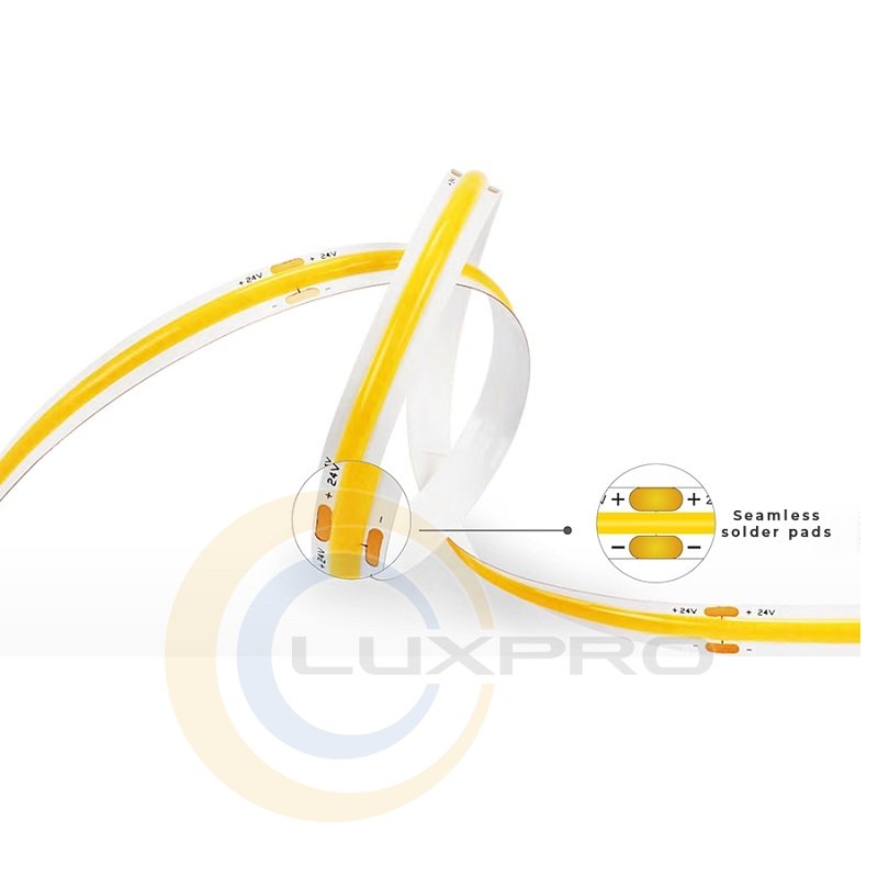 Світлодіодна стрічка PROLUM™ 24V; СОВ; 320; LED; IP20; Series "PRO", Нейтральний-Білий (3800-4300K) являє собою тонку друковану плату, з одного боку якої напаяні світлодіоди, а з іншого знаходиться основа, що наклеюється.