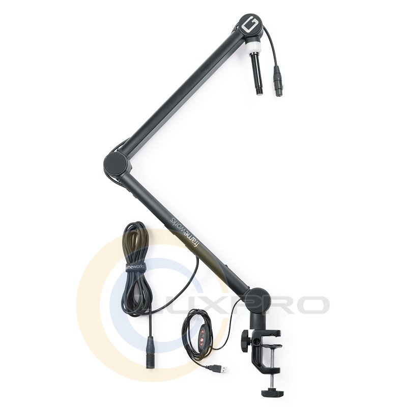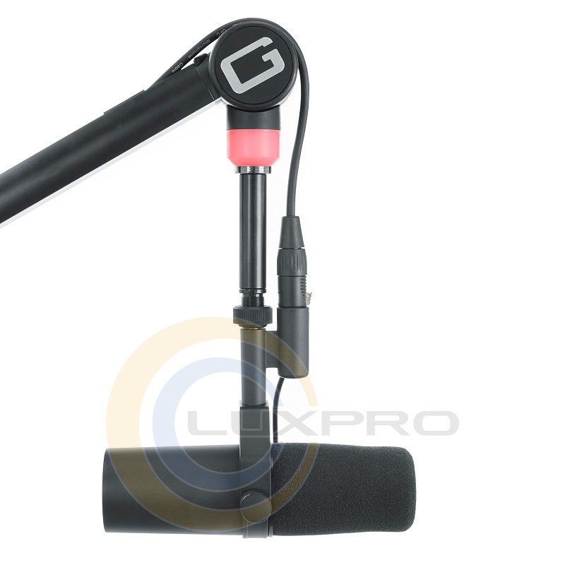 Включає знімний мікрофонний кабель XLR (3 м) для підключення більшості студійних мікрофонів. Вбудоване кільце світлодіодного індикатора з регулюванням яскравості та червоним/синім/фіолетовим кольорами. Фіксований USB-кабель довжиною 2.1 м із внутрішньою напрямною забезпечує живлення для освітлення. Легко затискається або кріпиться безпосередньо до столів, столів та поверхонь аналогічного розміру, максимальна товщина 55 мм. Обертається на 360 градусів з мінімальним шумом. Декілька ручок для кріплення мікрофона під потрібним кутом.