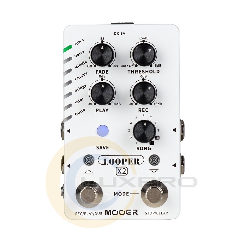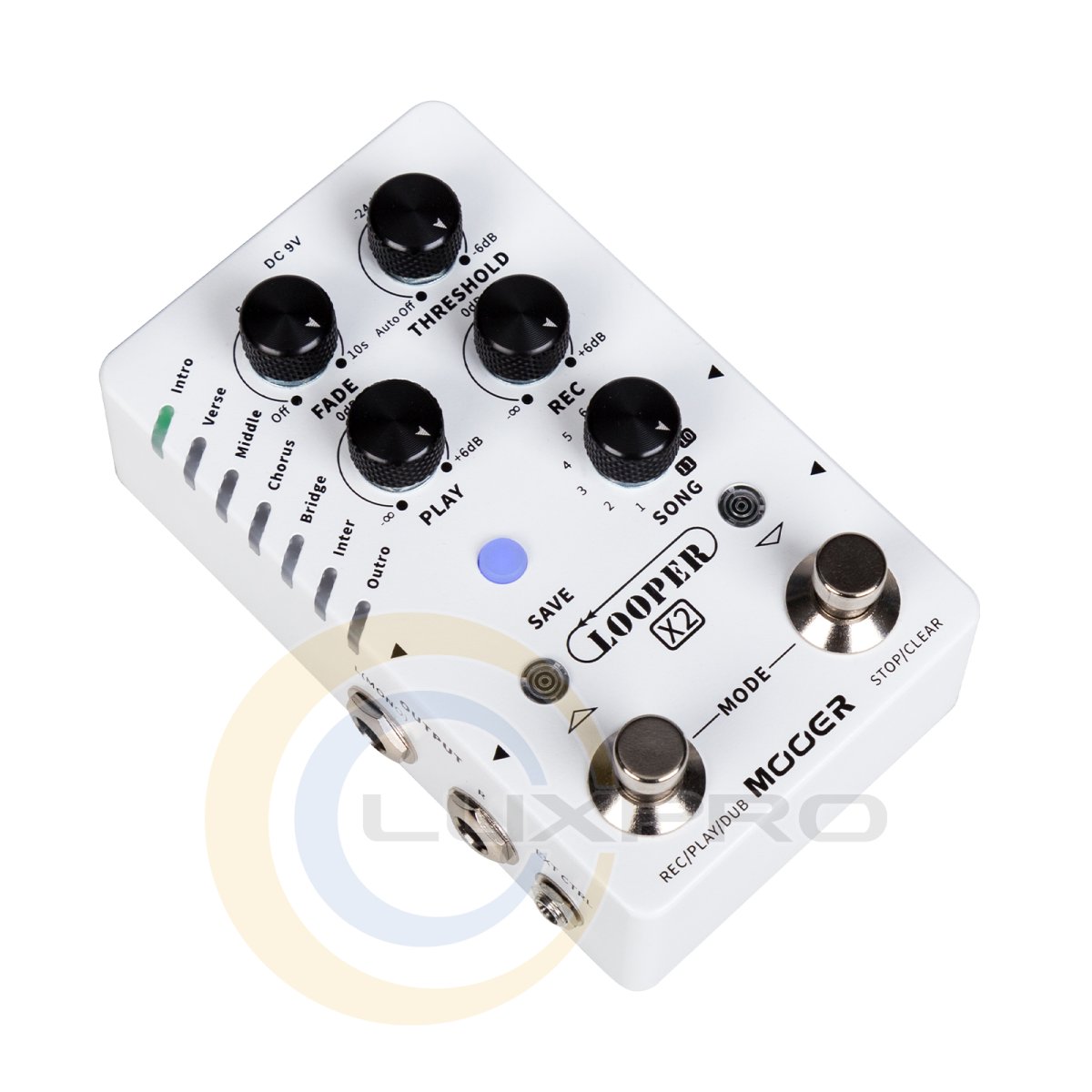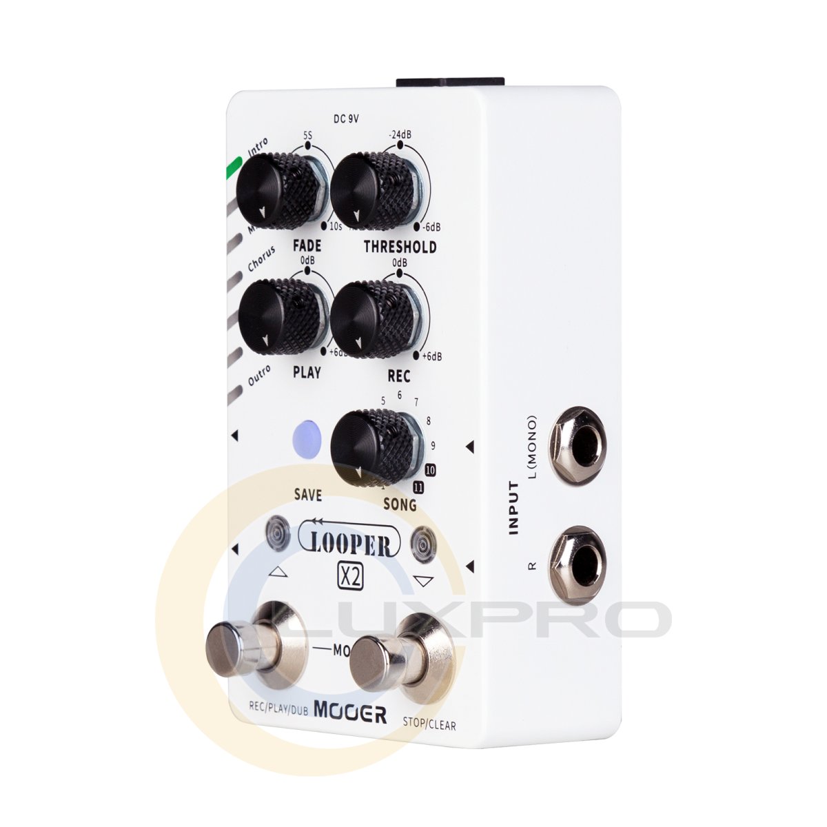 Looper X2 - це педаль-лупер з двома ножними перемикачами, призначена для швидкого створення лупів без браку місця для збереження ваших улюблених треків та семплів. З 11 банками пісень, кожен з яких має 7 слотів для збереження, Looper X2 забезпечує загалом 300 хвилин запису (2,5 хвилини на слот у банку 1-9, по 10 хвилин кожен у банку 10, 11). Кожен слот також відповідає загальній структурі пісень, щоб спростити організацію розділів та доріжок, як зазначено на передній частині педалі. Слотами для збереження та записаними треками також можна керувати за допомогою спеціалізованого програмного забезпечення для редагування, яке можна завантажити безкоштовно та яке сумісне з ПК Mac та Windows.