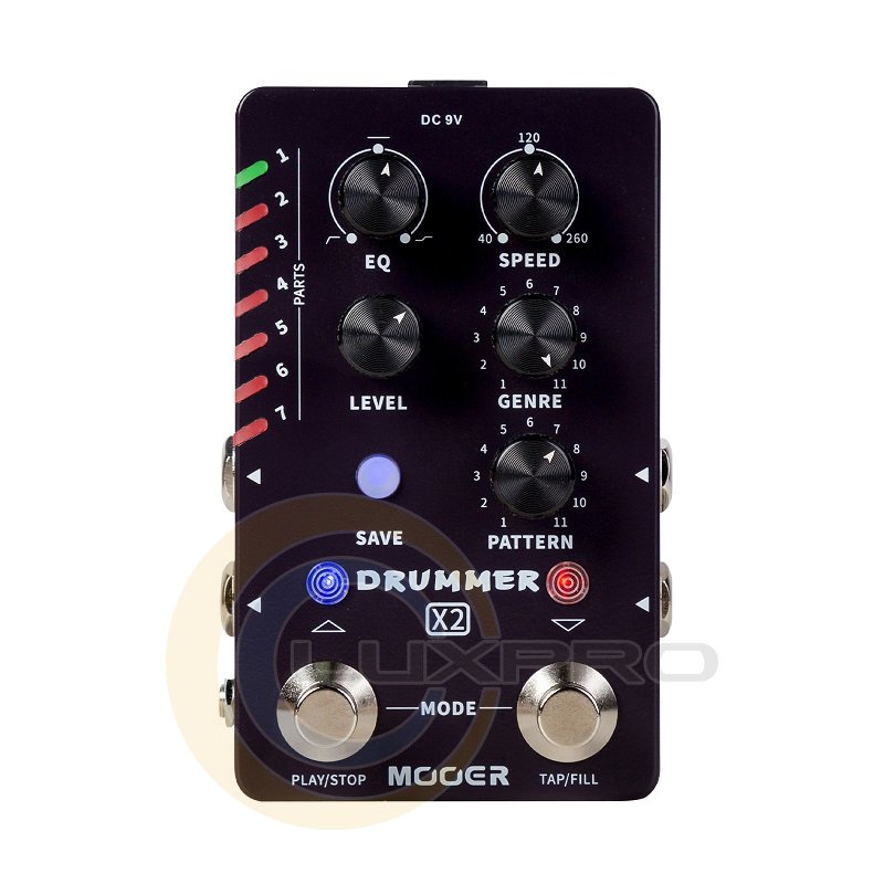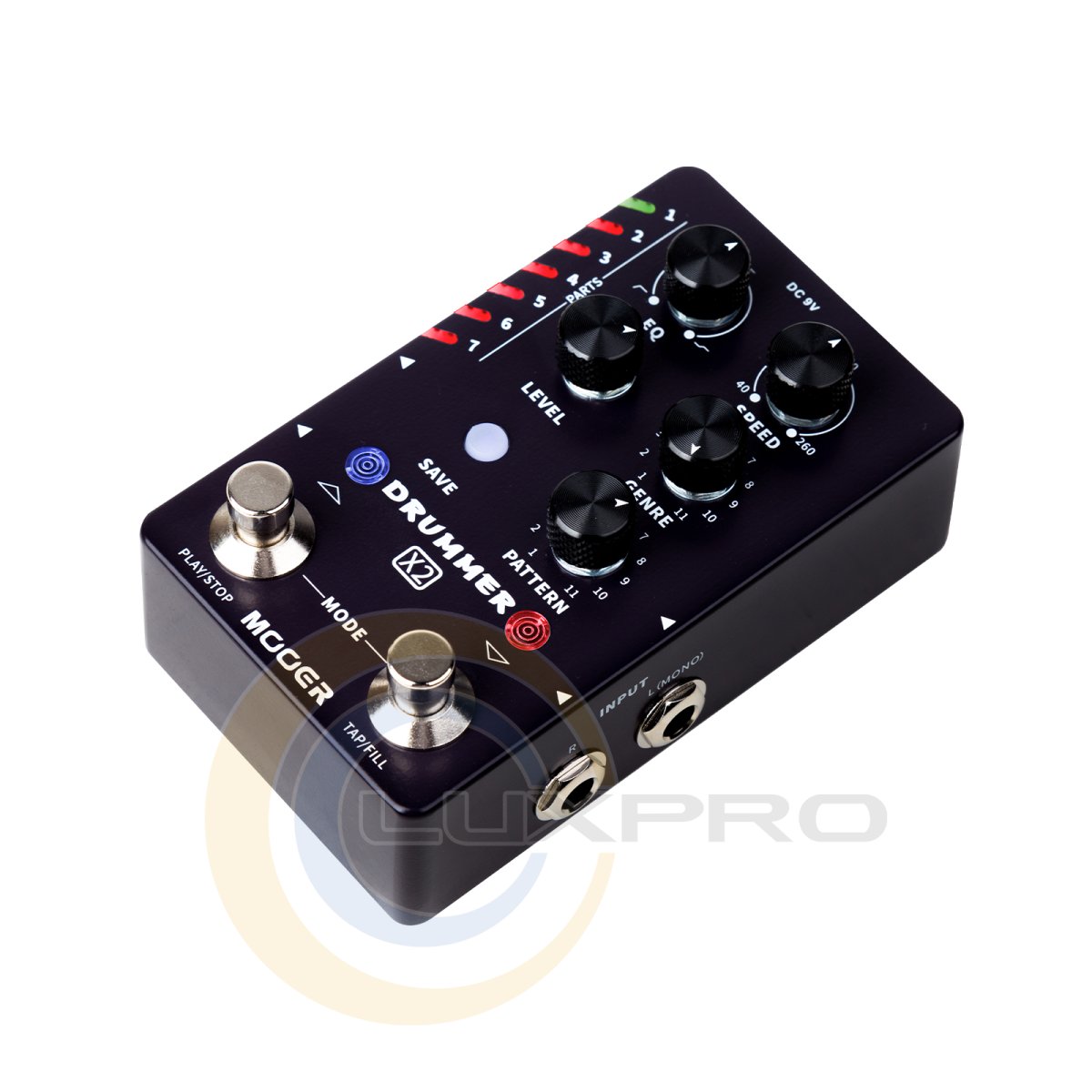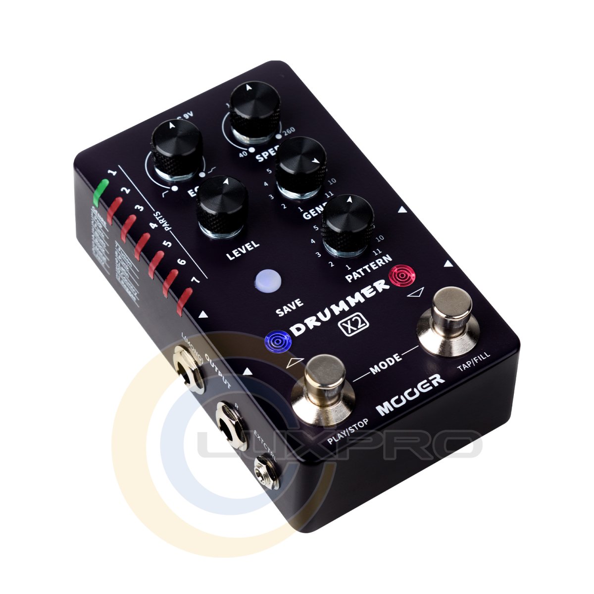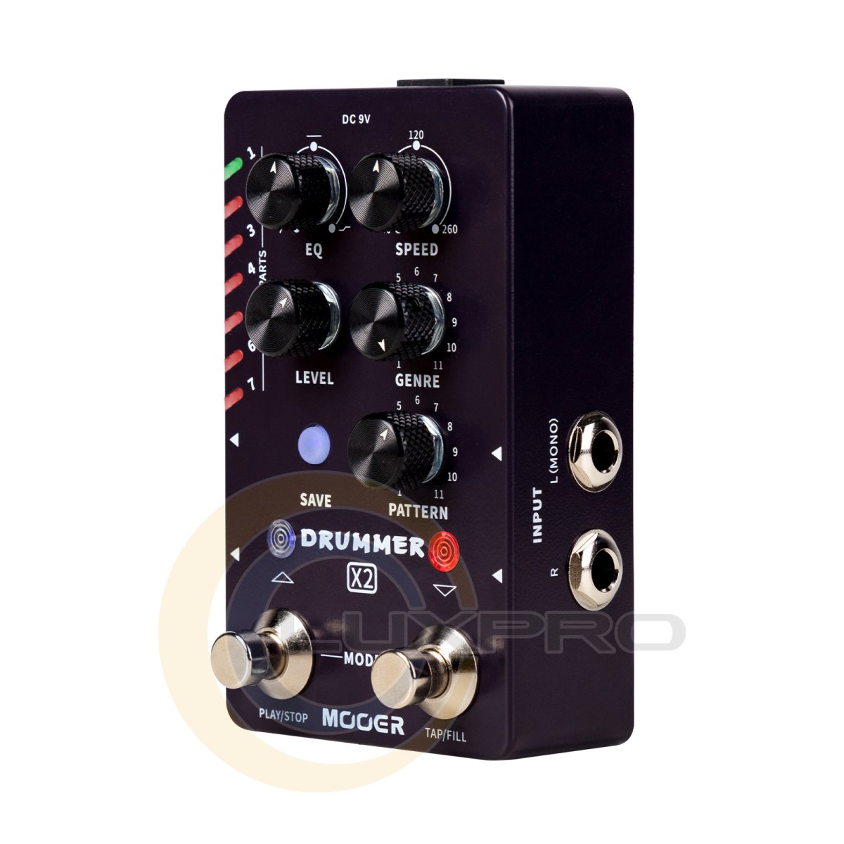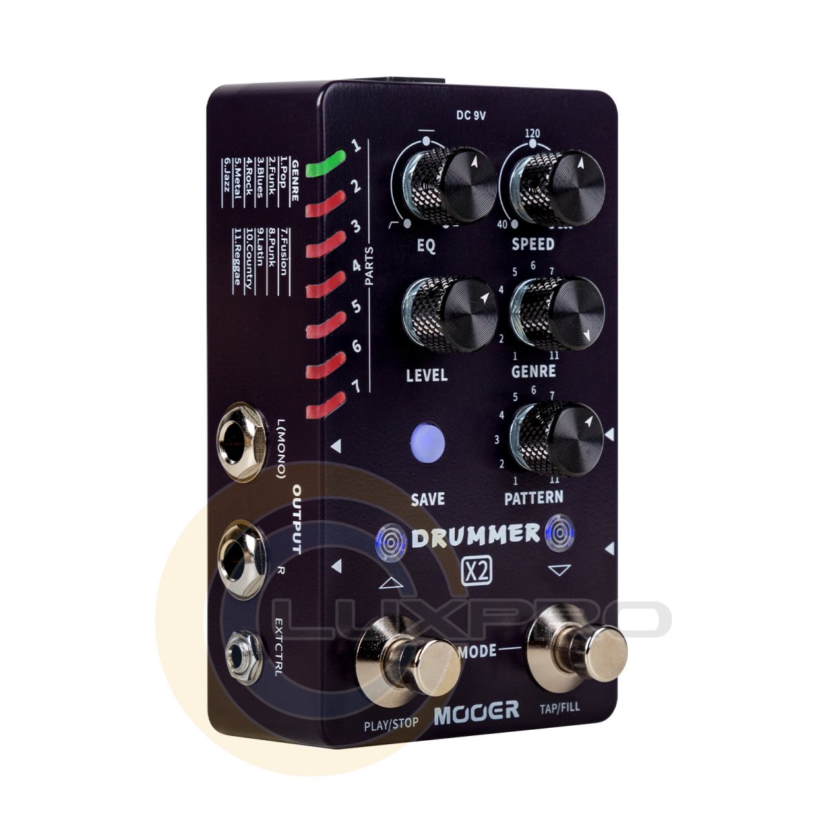 Drummer X2 оснащений інтерфейсом користувача з двома перемикачами для швидкого включення/вимкнення, прокручування барабанних грувів і активації збивки за допомогою функції FILL, що запускається правим перемикачем, і всім цим зручно керувати під час гри. Для простого керування пресетами та оновлення прошивки є спеціальне програмне забезпечення - редактор, яке можна завантажити з офіційного веб-сайту MOOER. Як і в інших пристроях X2, Drummer X2 включає стерео вхід/вихід і ¼" вихід для підключення додаткового футсвіча. 11 різних музичних жанрів з 11 різними грувами для кожного стилю.