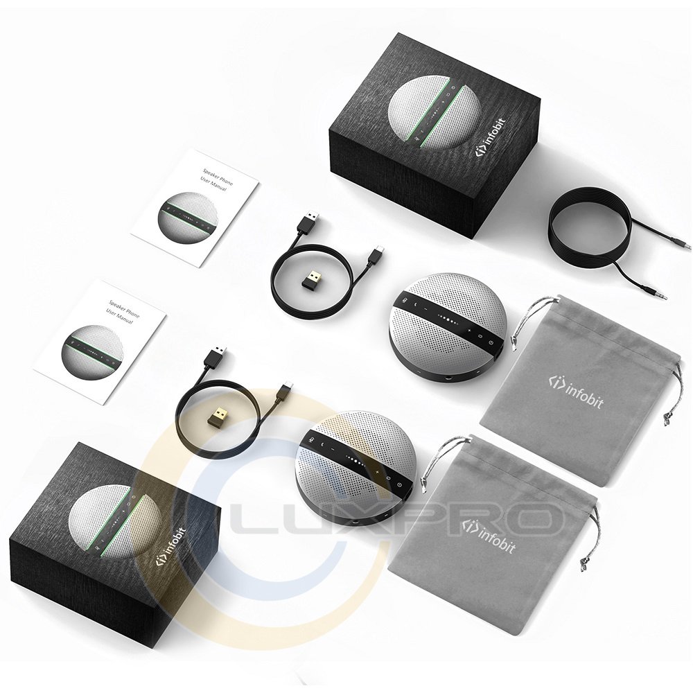 Особливістю пристрою є можливість каскадного підключення з іншим аналогічним спікерфонам Infobit iSpeaker M400 через аудіокабель 1/8" Jack TRS. Це дозволяє розширити діапазон зв'язку для великих конференц-залів. На корпусі спікерфону розташовані кнопки відключення мікрофона, регулювання гучності, прийняття дзвінка Для заряджання та підключення на корпусі пристрою розташований порт USB-С, а для підключення до іншого спікерфону роз'єм 1/8" Jack TRS. Додатково до комплекту входить чохол для зберігання.