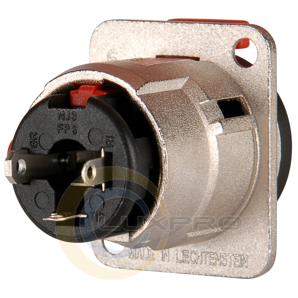 3-контактна панель NJ3FP6C забезпечує стабільне і безпечне з'єднання при відключенні або від ненавмисного або випадкового роз'єднання. Захисний панельний роз'єм підтримує стандартні TS-моно або TRS-стерео коннектори. Захисний замок розмикається тільки при натисканні на червоній засувку. Стандартний формфактор для панелі D-розміру. Також гніздо обладнано висновком під заземлення.Особливості: