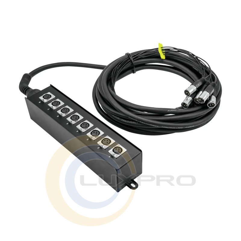 Професійний сценічний бокс з 8 сигнальними лініями та 3-контактними роз'ємами XLR. Дуже гнучкий 20-метровий багатожильний кабель з поканальним маркуванням. Усі сигнальні лінії збалансовані, кожен канальний кабель складається з 2 провідників та індивідуальної жили заземлення для кожного з 8 каналів.