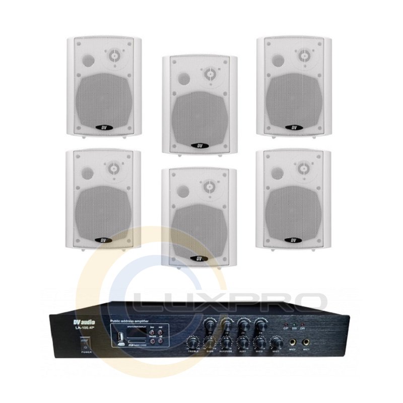 Акустичний комплект LA1006PB5W. Акустична система DV audio PB-5.2T IP White. Двосмугова акустична система для передачі звукового сигналу у приміщеннях ресторанів, торгових центрів, кафе, готелях, офісах, спортивних клубах. Потребу настінного монтажу. Пластиковий корпус з металевими гратами, монтажний кронштейн у комплекті. Декілька режимів роботи. Має рівень захисту IP65, що дозволяє використовувати ці системи на вулиці (OUTDOOR).