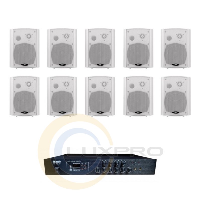 Акустичний комплект LA15010PB5W. Акустична система DV audio PB-5.2T IP White. Двосмугова акустична система для передачі звукового сигналу у приміщеннях ресторанів, торгових центрів, кафе, готелях, офісах, спортивних клубах. Вимагає настінний монтаж. Пластиковий корпус з металевими гратами, монтажний кронштейн у комплекті. Декілька режимів роботи. Має рівень захисту IP65, що дозволяє використовувати ці системи на вулиці (OUTDOOR).