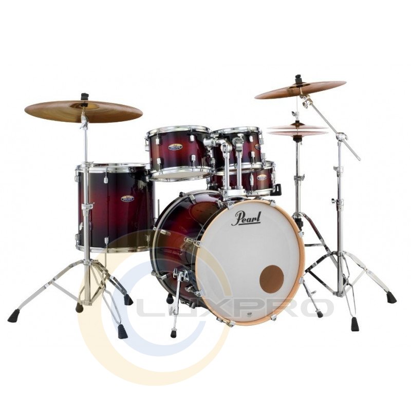 PEARL DMP-925S/C261 + Hardware Pack - ударна установка серії Decade Maple (2218B, 1008T, 1209T, 1616FT) з 6-ти шаровим корпусом з клена (товщина корпусу - 5,4 мм). У комплекті набір стійок (педаль Demonator, похила стійка під тарілку, пряма стійка під тарілку, стійка хай-хет, стійка під малий барабан), дерев'яний малий барабан 14х5,5 ", система підвісу томів Opti-Lock, сталеві штамповані обода 1,6 мм, хромована фурнітура. Колір покриття - Gloss Deep Red Burst.