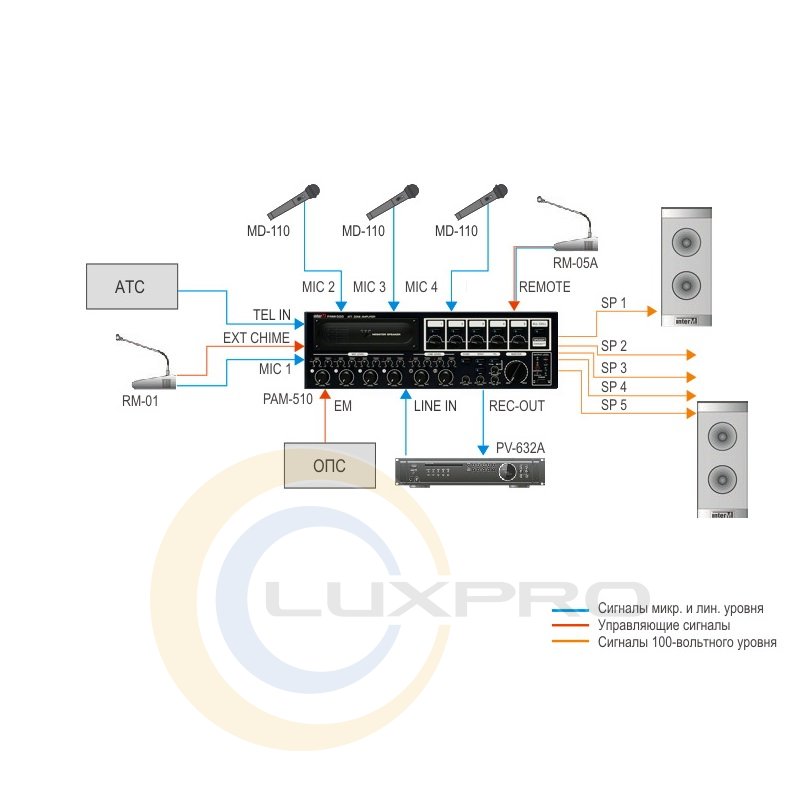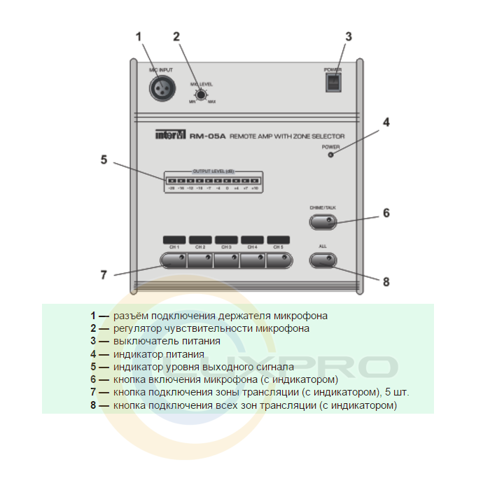 Призначений для дистанційного вибору зон і видачі в них голосових оголошень при спільному використанні з мікшуючий підсилювач потужності Inter-M PAM-340A / 480A / 510/520. Може також використовуватися з іншими підсилювачами (при наявності зовнішнього джерела живлення +24 В і модуля зональних реле).