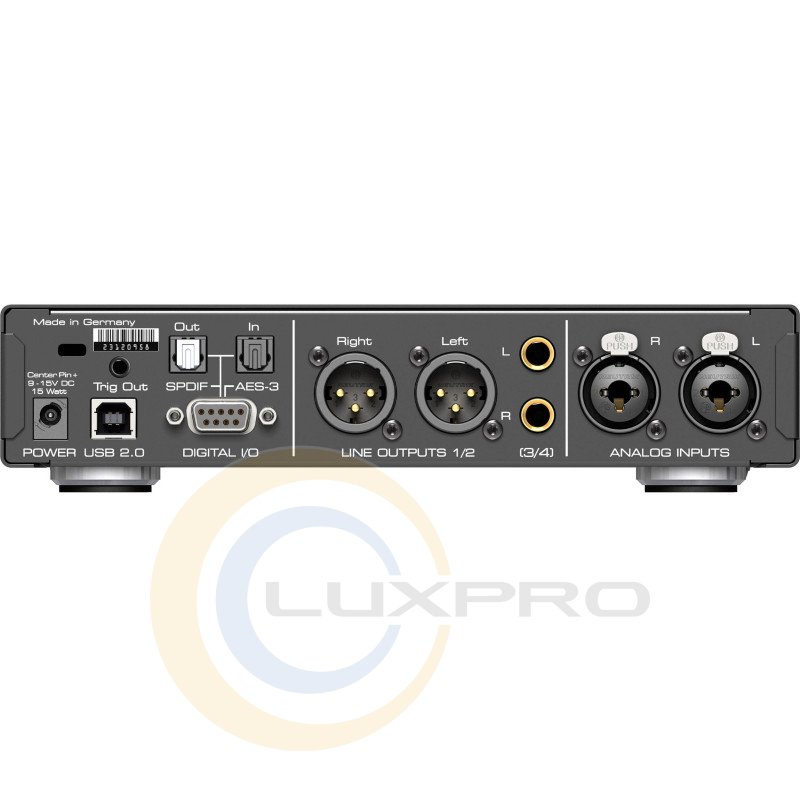 - роз'єми: 2 х line input XLR / 6.3 mm jack combo, 2 х line output XLR, 2 х line output 6.3 mm jack, 2 х stereo headphone output 6.3 mm jack, 1 х headphone output 4.4 mm Pentaconn balanced, ADAT/S/PDIF/AES, USB 2.0;