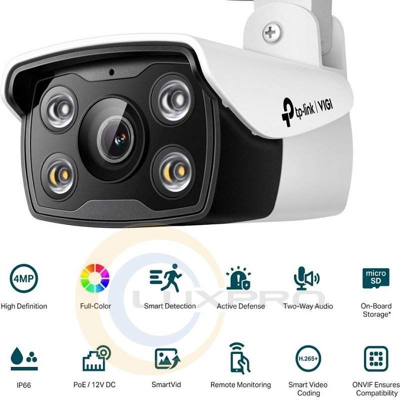 VIGI C340-4, PoE, 4Мп, 4 мм, H265+, IP66, Bullet - камера. Великий об'єктив, високочутлива матриця і біле підсвічування забезпечать цілодобове чітке кольорове зображення навіть у непроглядній темряві. Отримуйте повідомлення, коли хтось перетинає лінію, входить у зазначену зону, що охороняється, або загороджує камеру.