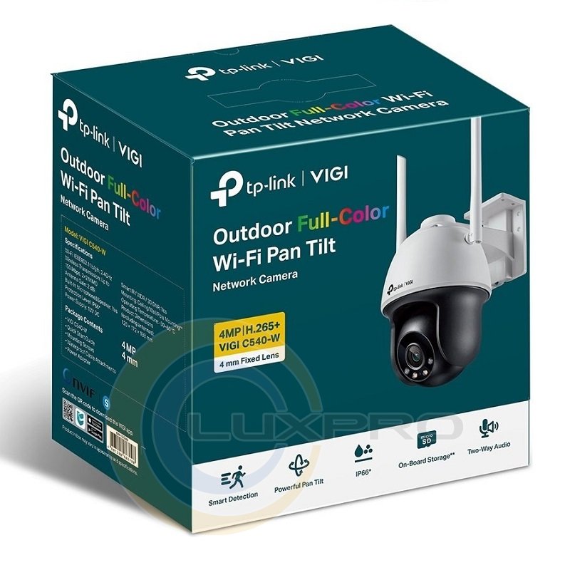 VIGI-C540-W-4, PoE, 4Мп, 4 мм, Wi-Fi, H265+, IP66, Dome - камера. Великий об'єктив, високочутлива матриця та біле підсвічування забезпечать цілодобове чітке кольорове зображення – навіть у непроглядній темряві. Отримуйте повідомлення, коли хтось перетинає лінію, входить у вказану зону, що охороняється, або загороджує камеру.
