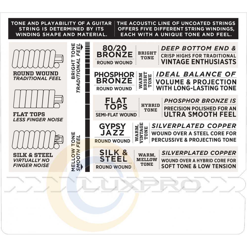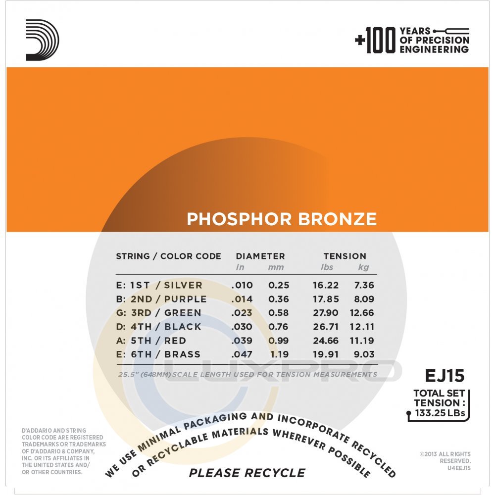 Струни D`Addario Phosphor Bronze мають обмотку з стійкою до корозії фосфорної бронзи намотаною на шестигранні средечнікі з вуглецевої сталі. Фосфорну бронзу у виробництві струн вперше представили D`Addario в 1974 році. Гітари зі струнами з фосфорної бронзи звучали яскраво, з теплотою і дуже збалансовано. У підсумку отримуємо живучі струни з яскравим звучанням і чудовою інтонацією.Характеристики: