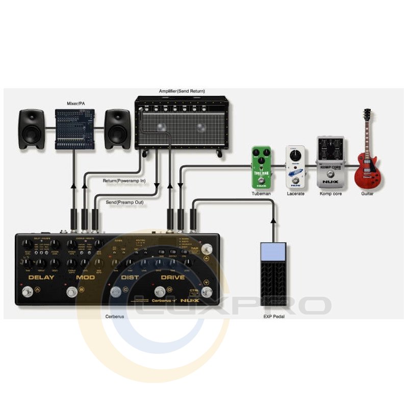 Вбудований завантажувач імпульсних відгуків гітарних кабінетів дозволяє використовувати NUX Cerberus як повністю самодостатній автономний пристрій на сцені та студії, для гри або запису прямо в лінію, позбавляючи залежності підсилювачів і громіздких акустичних колонок.