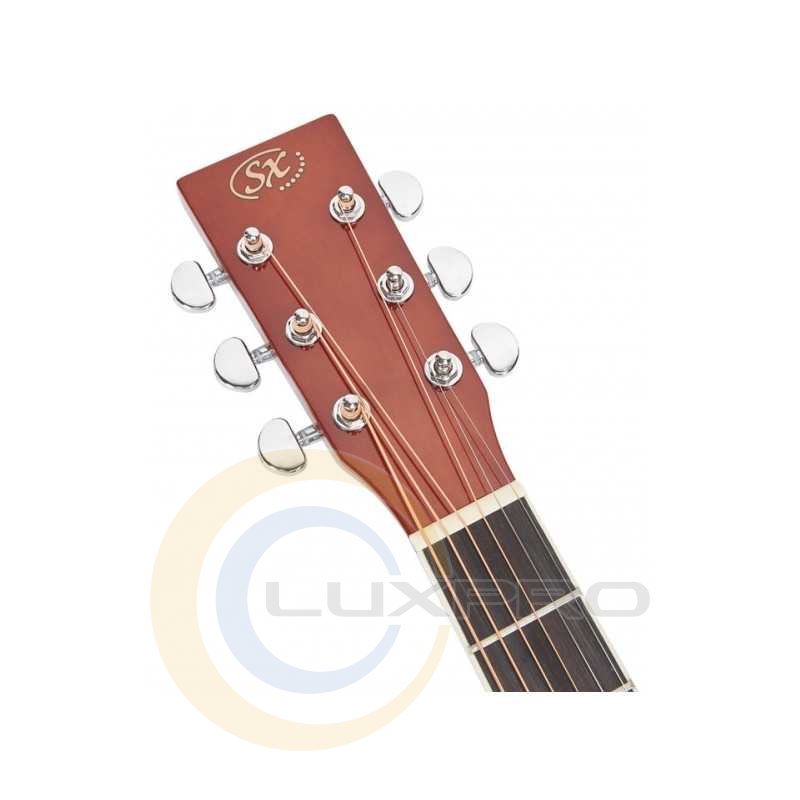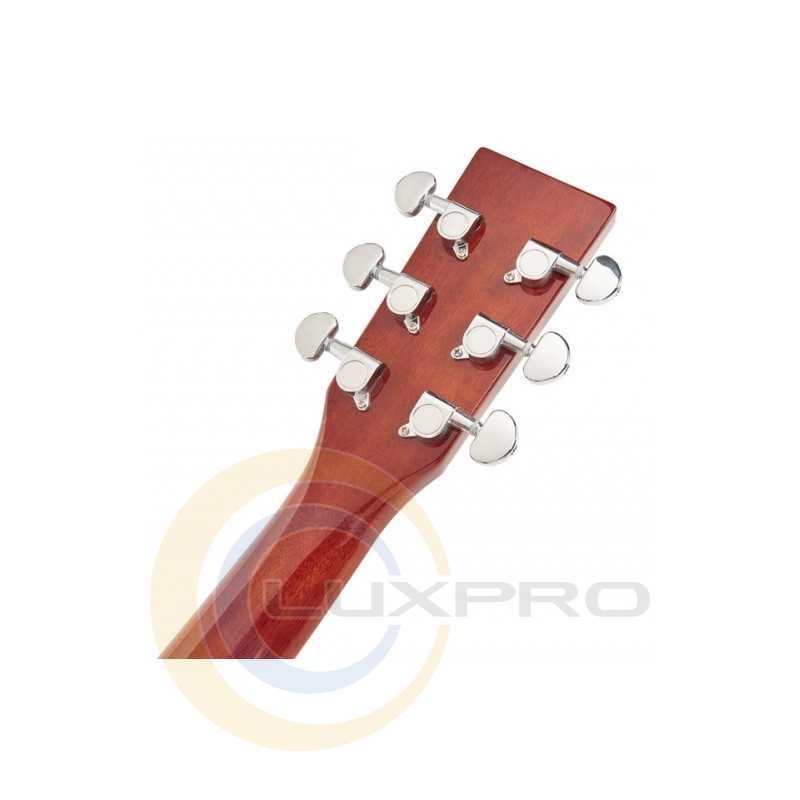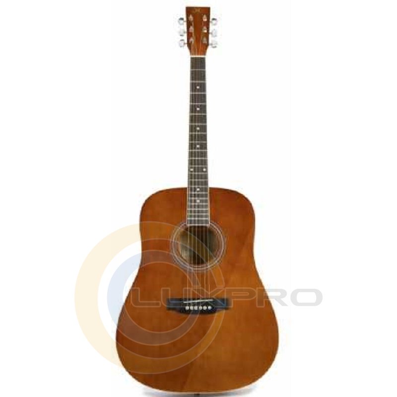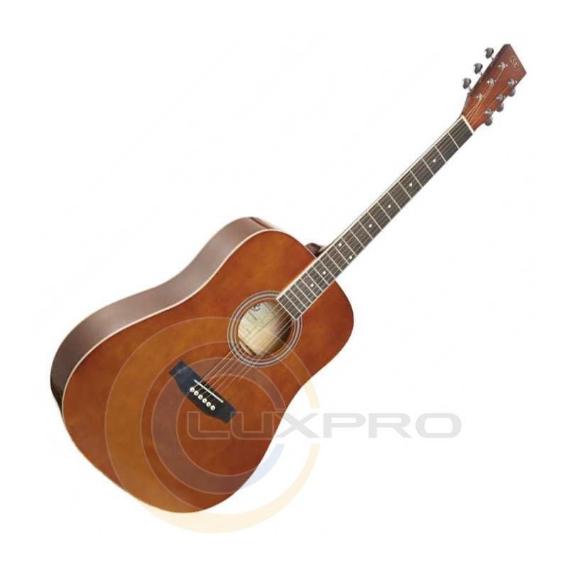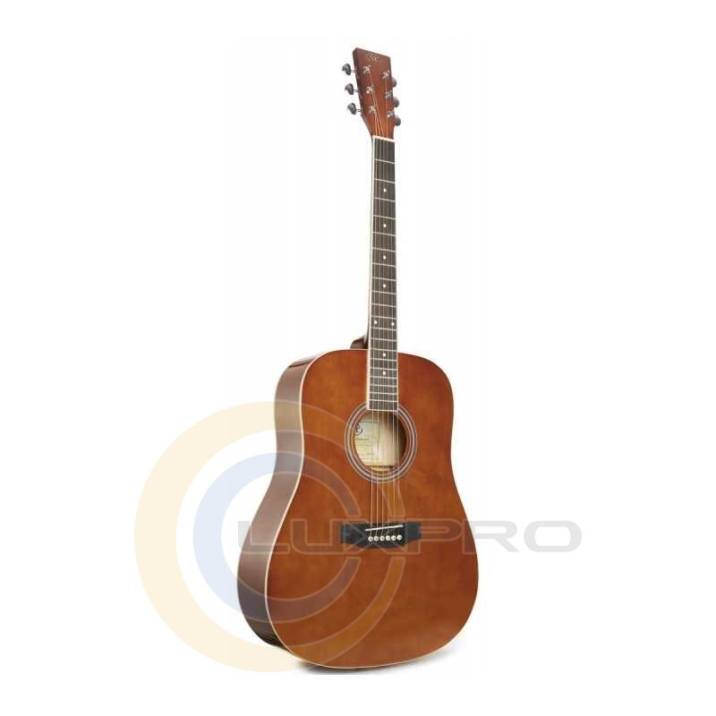 SD104GBR - акустична гітара, розмір: 4/4, форма: Dreadnought, мензура: 648 мм, колір: коричневий, матеріал верхньої деки: липа, задня дека та обичайка: липа, гриф: окуме, накладка грифа та бридж: палісандр, поріжок бриджа: пластик, колки: цілісно-литі з хромованим покриттям, покриття: глянсове.