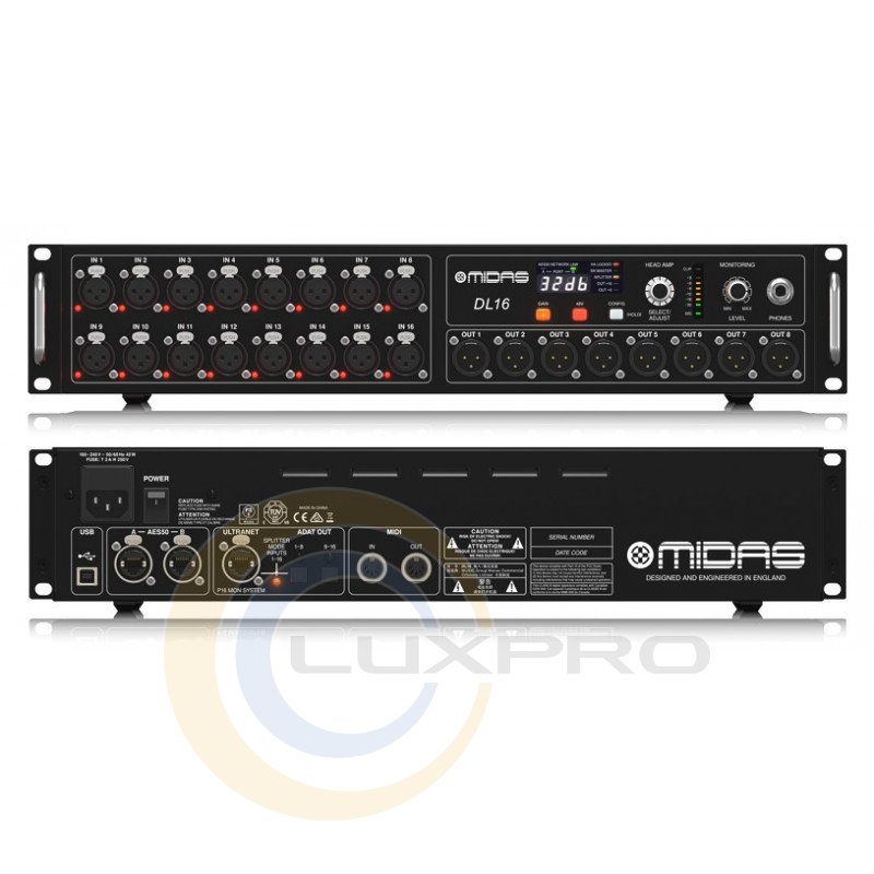 DL16 - стейджбокс. Зв'язуючи сцену і центральний пульт керування звуком, DL16 від Midas має 16 входів і 8 виходів, а також 16 повністю програмованих і віддалено керованих мікрофонних підсилювачів з перемикачами для подачі фантомного живлення + 48 В. Стейдж-бокс оснащений 8 електронно збалансованими низькоомними виходами ліній крім того, всі входи і виходи DL16 сприймають як балансний, так і небалансний сигнал, мінімізуючи можливість погіршення його якості, виникнення шуму і перехресних перешкод. DL16 також оснащений цифро-аналоговими перетворювачами Cirrus Logic, що забезпечують зниження рівня власного шуму та нижче спотворення сигналу, а також фільтрацію після конвертації для усунення широкосмугових перешкод.