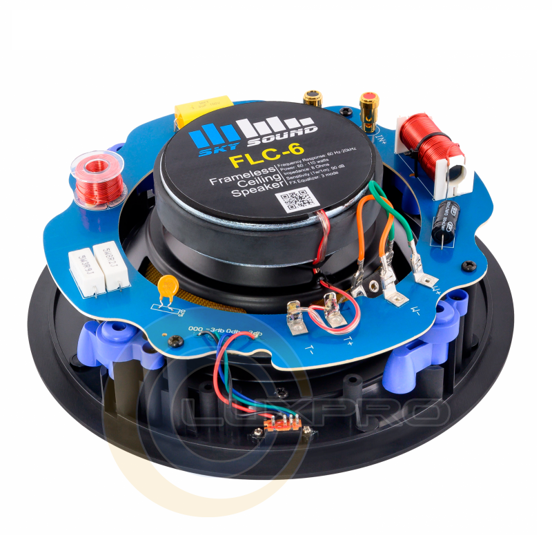 Компактний безкаркасний корпус стельових динаміків FLC-6W виготовлений з якісного полімеру ABS, додатково посиленого спеціальним наповнювачем для підвищення жорсткості та покращення антивібраційних властивостей. Захисна сітка колонки має магнітну фіксацію, що надає їй акуратнішого вигляду і спрощує обслуговування. Стельові динаміки випускаються у виконанні чорного кольору та підходять для встановлення практично у будь-яких інтер'єрах.